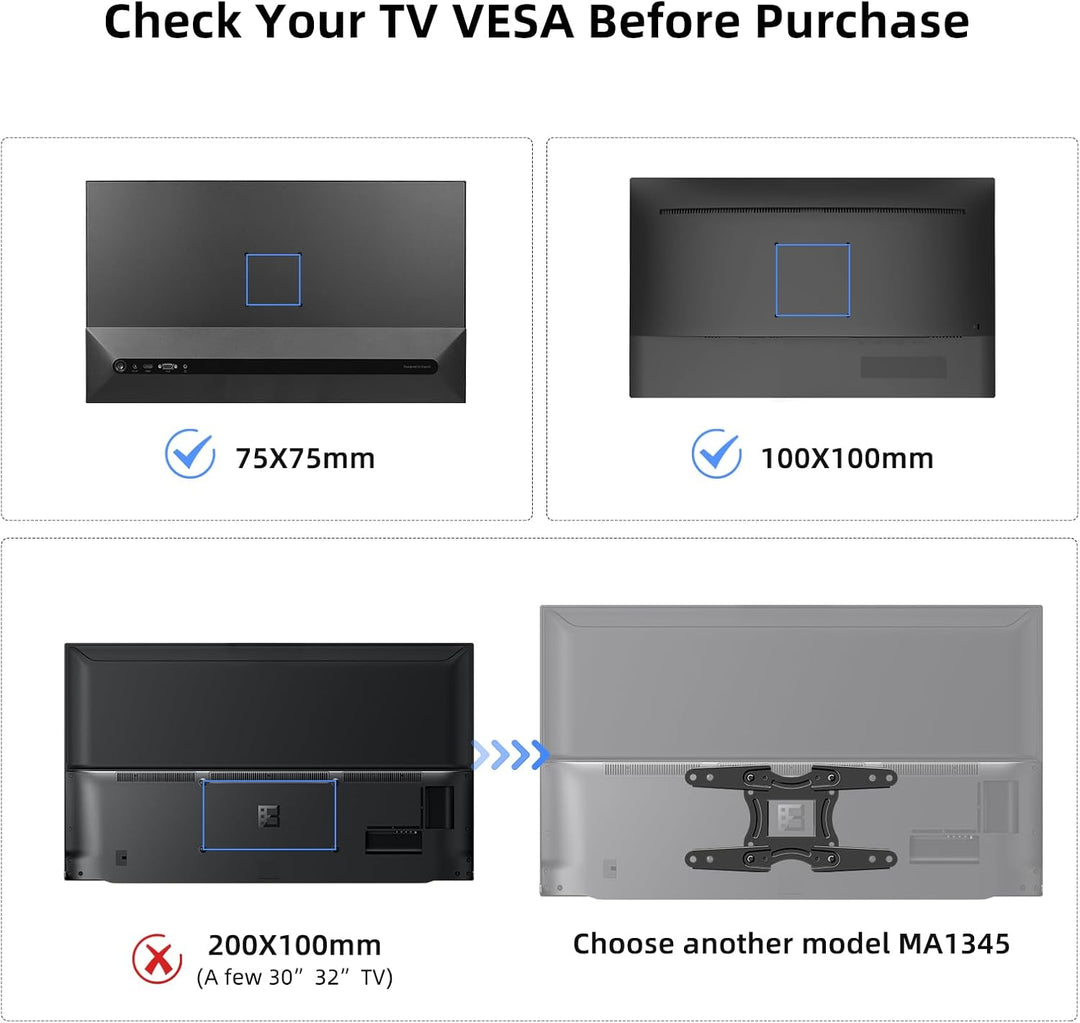 - MONITOR PERFEKTE LÖSUNG: Diese TV Wandhalterung passt für die meisten 15, 24, 27, 32 Zoll LED LCD Plasma, flachen und gebogenen Fernseher mit einem Gewicht von bis zu 13kg. Kompatible VESA Löcher: 75x75/100x100mm. Bitte bestätigen Sie vor dem Kauf