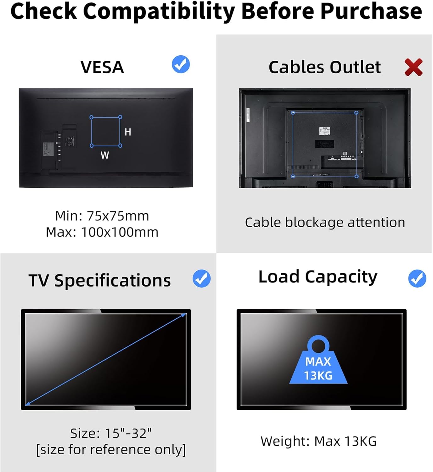 • Universelle Kompatibilität - PC monitor wandhalterung ist für eine vielzahl von displays und fernsehern geeignet und speziell für bildschirme von 15 bis 32 Zoll entwickelt. Sie unterstützt ein gewicht von bis zu 13 kg und VESA-Grössen von 75x75