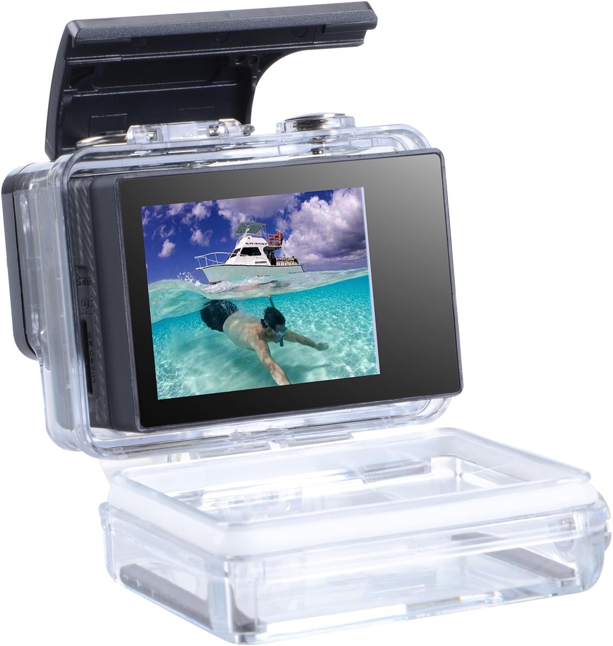 • 4. montieren Sie die Verlängerung hintere Abdeckung an der vorderen Schale. Wasserdicht 114 ft, beim Tauchen, regnerischen Tag, Schnorcheln, Schwimmen, etc. Auch in Echtzeit können Sie Ihre Fotos und Videos betrachten.