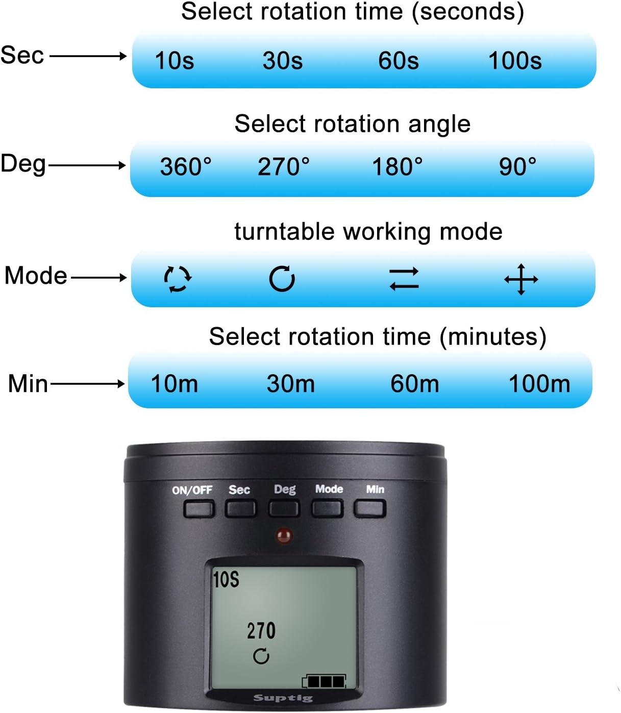 • Mehrere Optionen, um Ihre Anforderungen zu erfüllen: Auswahl der Rotationszeit (10s, 30s, 60s, 100s, 10m, 30m, 60m, 120m), Drehwinkelauswahl (360°, 270°, 180°, 90°), Modus (Kreisrotation/Einzelrotation/hin und her drehen/90° zu bleiben).