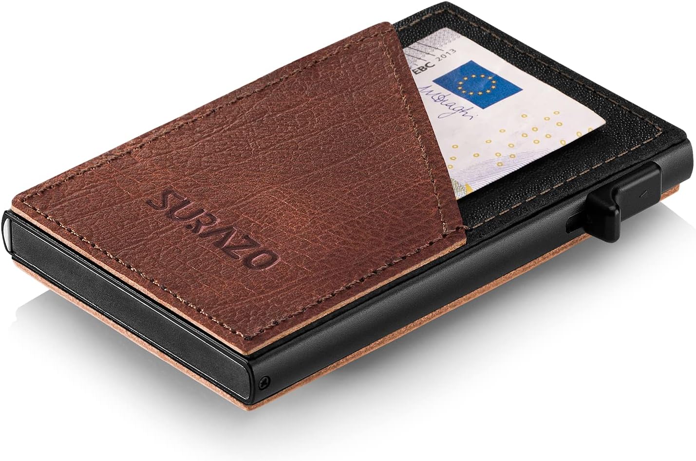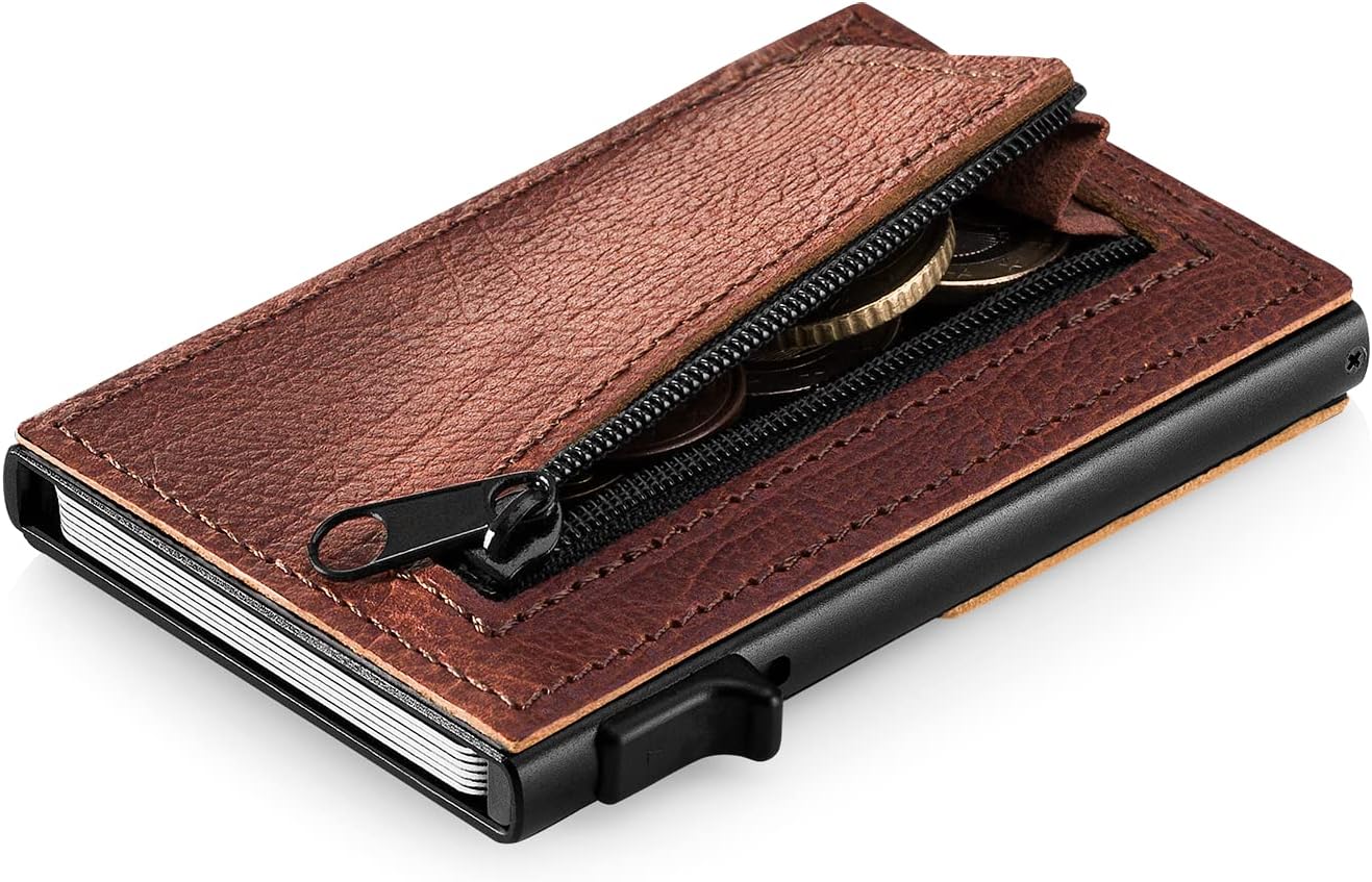 - ✅ 𝗣𝗲𝗿𝗳𝗲𝗸𝘁𝗲 𝗞𝗮𝗽𝗮𝘇𝗶𝘁𝗮̈𝘁: PopUp Metallhülle mit schnellem Zugriff bis 8 Karten. Zuständlicher 1 Fach für Geldscheine und 1 Münzfach mit sicher Reissverschluss. Diese praktische Slim Geldbörse bietet
