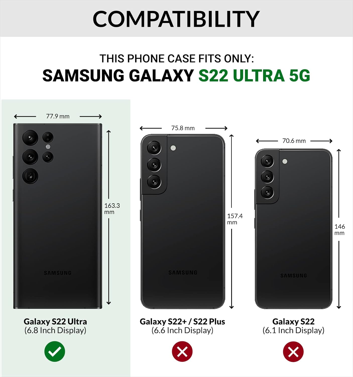 - ✅KOMPATIBILITÄT - Volle Kompatibilität nur mit Samsung Galaxy S22 Ultra 5G (6.8 Zoll) [es gibt 3 Versionen des Galaxy S22 Serie] 👈 Vor dem Kauf dieser Handyhülle prüfen Sie zwei Mal Ihr Handy Modell. Speziell entwickelten Ausschnitte und