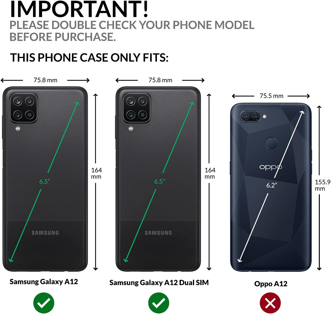 - ✅ KOMPATIBILITÄT - Volle Kompatibilität nur mit Samsung Galaxy A12 und A12 Dual SIM (6.5 Zoll) 👈 Vor dem Kauf dieser Handyhülle prüfen Sie zwei Mal Ihr Handy Modell. Speziell entwickelten Ausschnitte und Öffnungen in der Hülle für alle