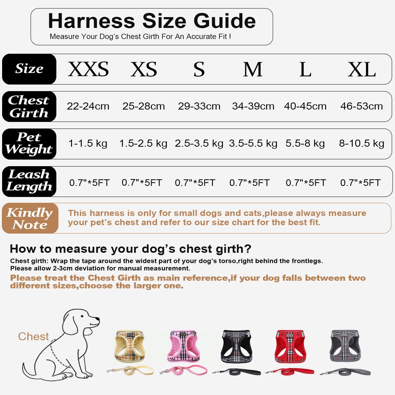 - 【MUSS MESSEN】- Dieses Geschirr ist für kleine Hunde und Katzen geeignet. Bitte messen Sie vor der Bestellung immer die Brust Ihres Haustieres und beziehen Sie sich auf unsere Grössentabelle für die beste Passform.