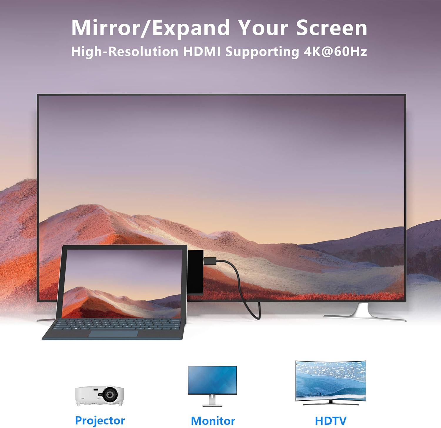 - 【Design für Surface Pro 7】 Surface Pro 7 Hub Verwandelt die USB-A-Verbindung und USB C in 7 Anschlüsse (HDMI 4K / 30Hz, USB C 60W PD-Ladeanschluss, USB C 5 Gbit / s-Datenanschluss, 2 USB 3.0-Anschluss, SD & MicroSD-Kartenleser) * Hinweis 1: Dieses