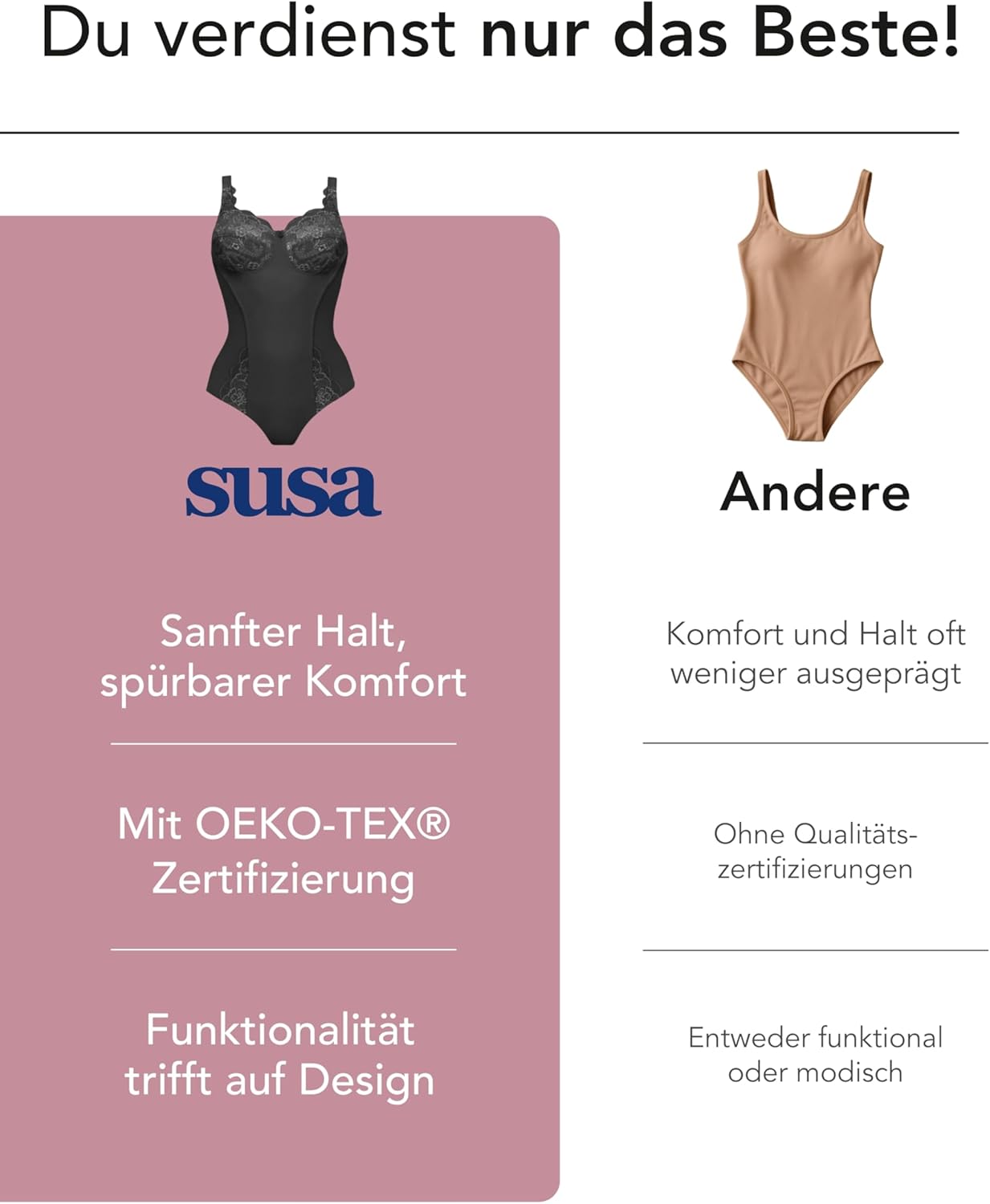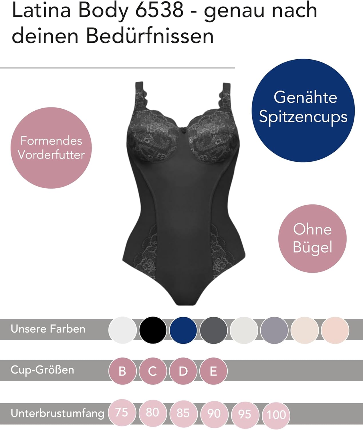 PRODUKTBESCHREIBUNGEN Modischer Body mit hübscher Spitze im Cup und am Beinausschnitt. Das Untercup mit Futter sorgt für stabilen Halt. Der verstellbare Träger im Vorderteil ist mit Spitze besetzt.