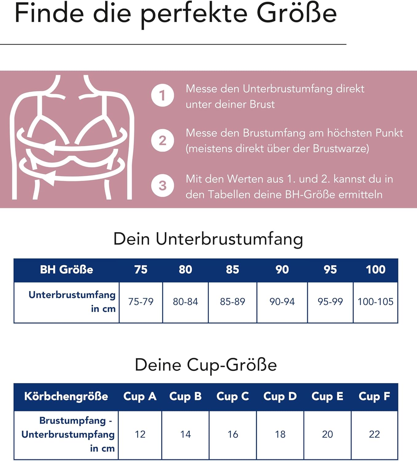 - GEMOLDETE CUPS: Gemoldete Cups sorgen dafür, dass der Bügel BH sicher sitzt. Damit legt jede Frau jederzeit einen stilvollen Auftritt hin. Die Spacer Schale ist stabil, aber luftdurchlässig und ermöglicht ein frisches Trageklima