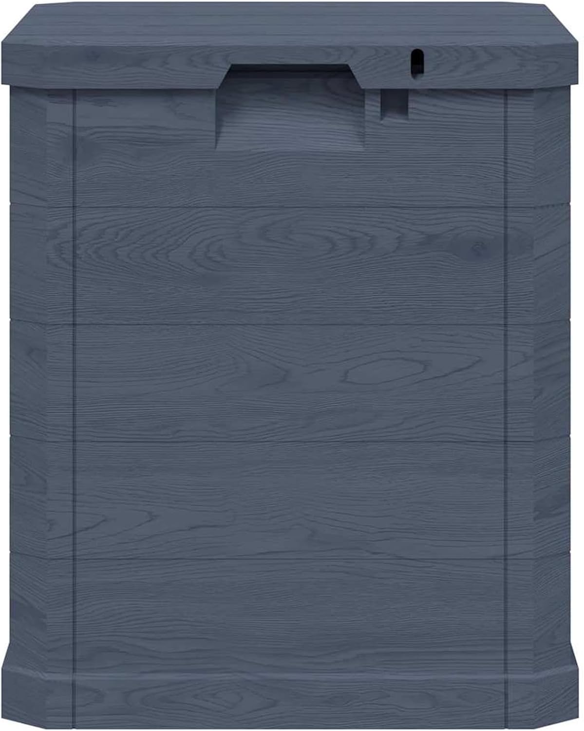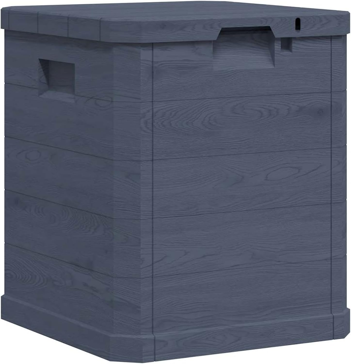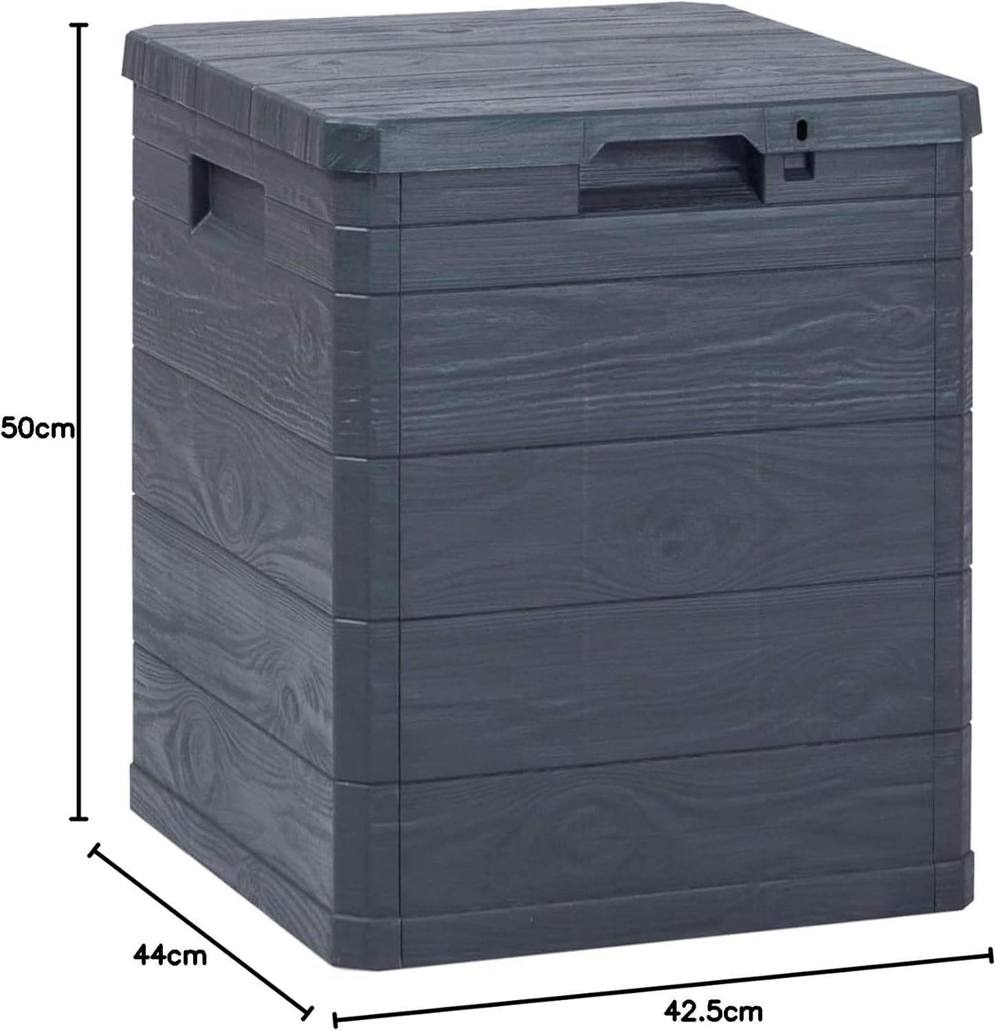 - Produkte eigenschaften: Farbe: Anthrazit Material: Kunststoff (mit Holzoptik) Masse: 42,5 x 44 x 50 cm (L x B x H) Fassungsvermögen: 90 L Abschliessbar (Schloss ist nicht inbegriffen) Geeignet für den Innen- und Aussenbereich