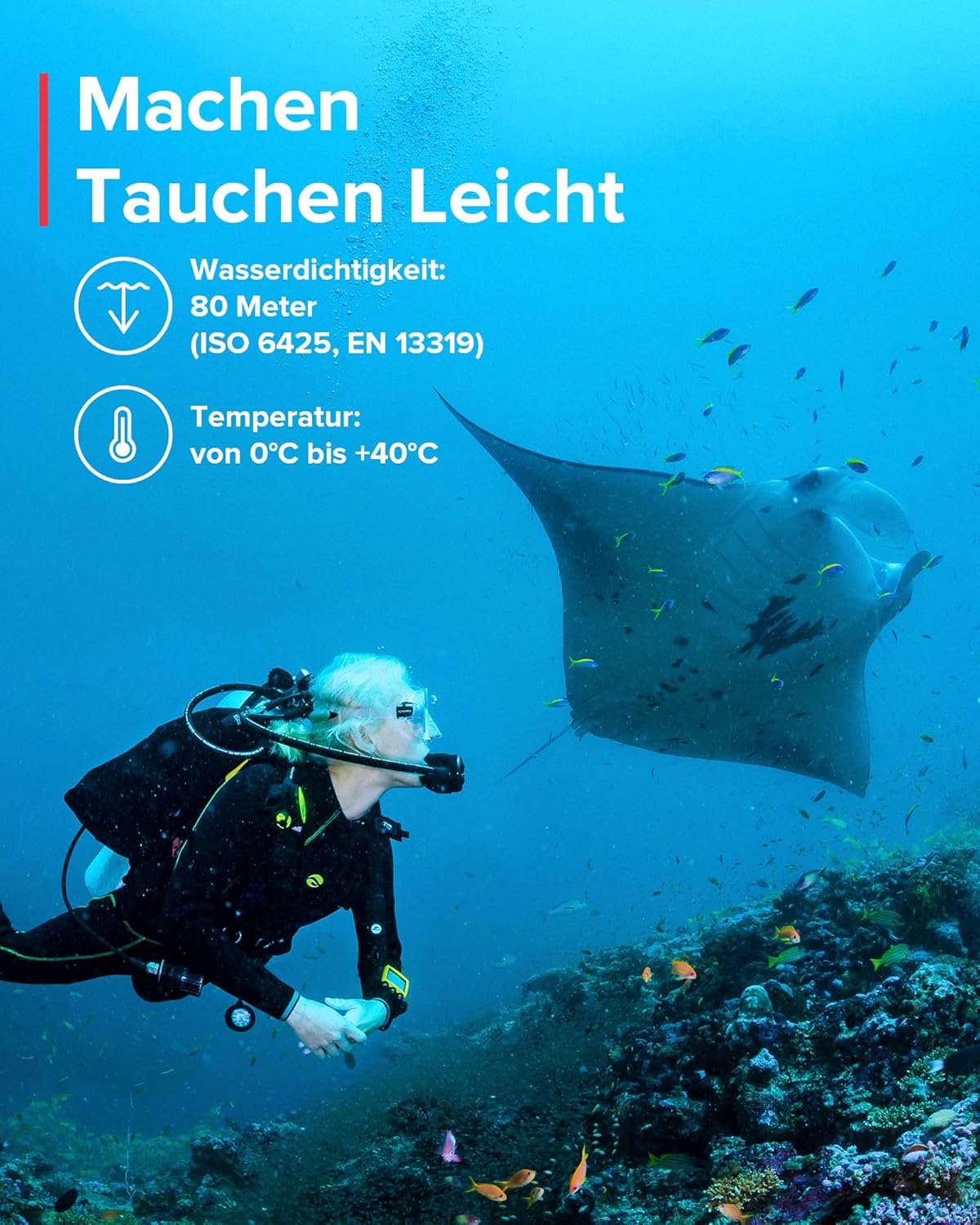 - Sichere Navigation dank 3D-Kompass, Modi: Luft-/Nitrox- und Messmodus mit Bottom Timer, Trimix-Unterstützung, CCR-kompatibel, zum Tauchen mit offenem und geschlossenem Kreislauf geeignet, Drahtlose Verbindung für Flaschen- und Gasdaten, Planer für