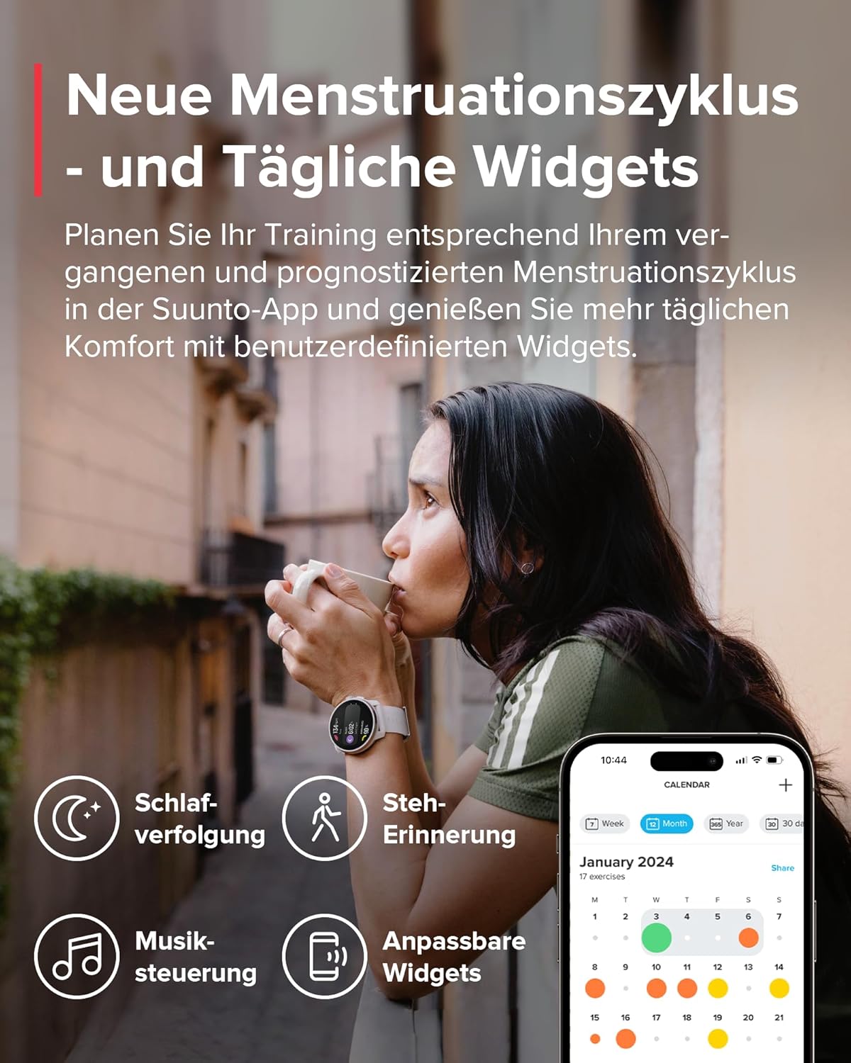 • MENSTRUATIONSZYKLUS-TRACKING - Eine neue Funktion der Suunto-App ermöglicht es Ihnen, vergangene und zukünftige Menstruationszyklen zu verfolgen, Trainingsdaten basierend auf den Menstruationszyklen anzuzeigen und das Training zu planen