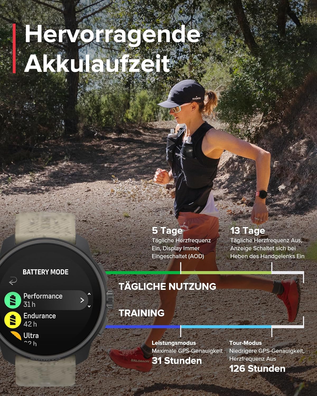 • ÜBERLEGENE AKKULAUFZEIT - Die Akkulaufzeit der Race S ist sehr konkurrenzfähig: Bis zu 30 Stunden GPS mit bester Genauigkeit, ohne Sorgen während Ihrer Marathons und Trails; Im täglichen Modus können Sie die Uhr tragen, um die Herzfrequenz und den