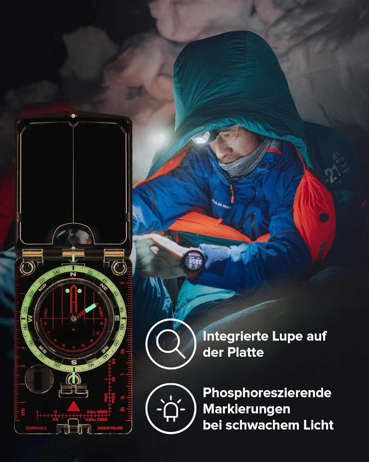 • Ausrichtung nach Norden, Gute Lesbarkeit bei schlechten Lichtverhältnissen durch leuchtende Markierungen, Einstellbare Deklinationskorrektur, Herstellung in Finnland