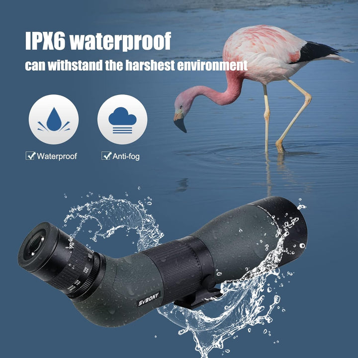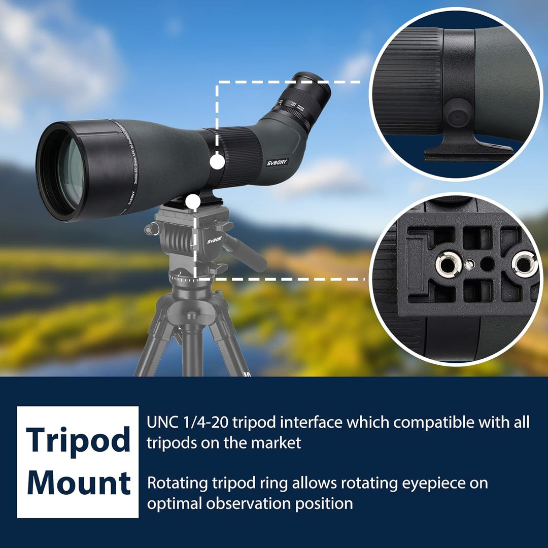 - Drehbarer Stativkragen; verstellbarer Stativkragen ermöglicht das Drehen des Okulars in eine optimale Position für die Vogelbeobachtung; unc 1/4-20 Stativschnittstelle die auf einem Stativ montiert werden kann