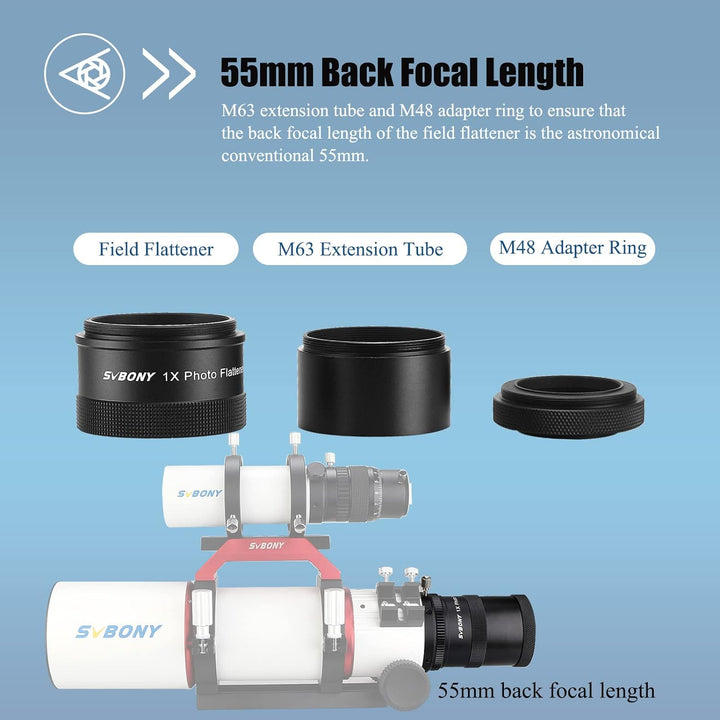 - SV209 ist mit M63 Verlängerungsrohr und M48 Adapterring ausgestattet; um sicherzustellen; dass die hintere Brennweite des Feldglätters die astronomische konventionelle 55mm Länge ist