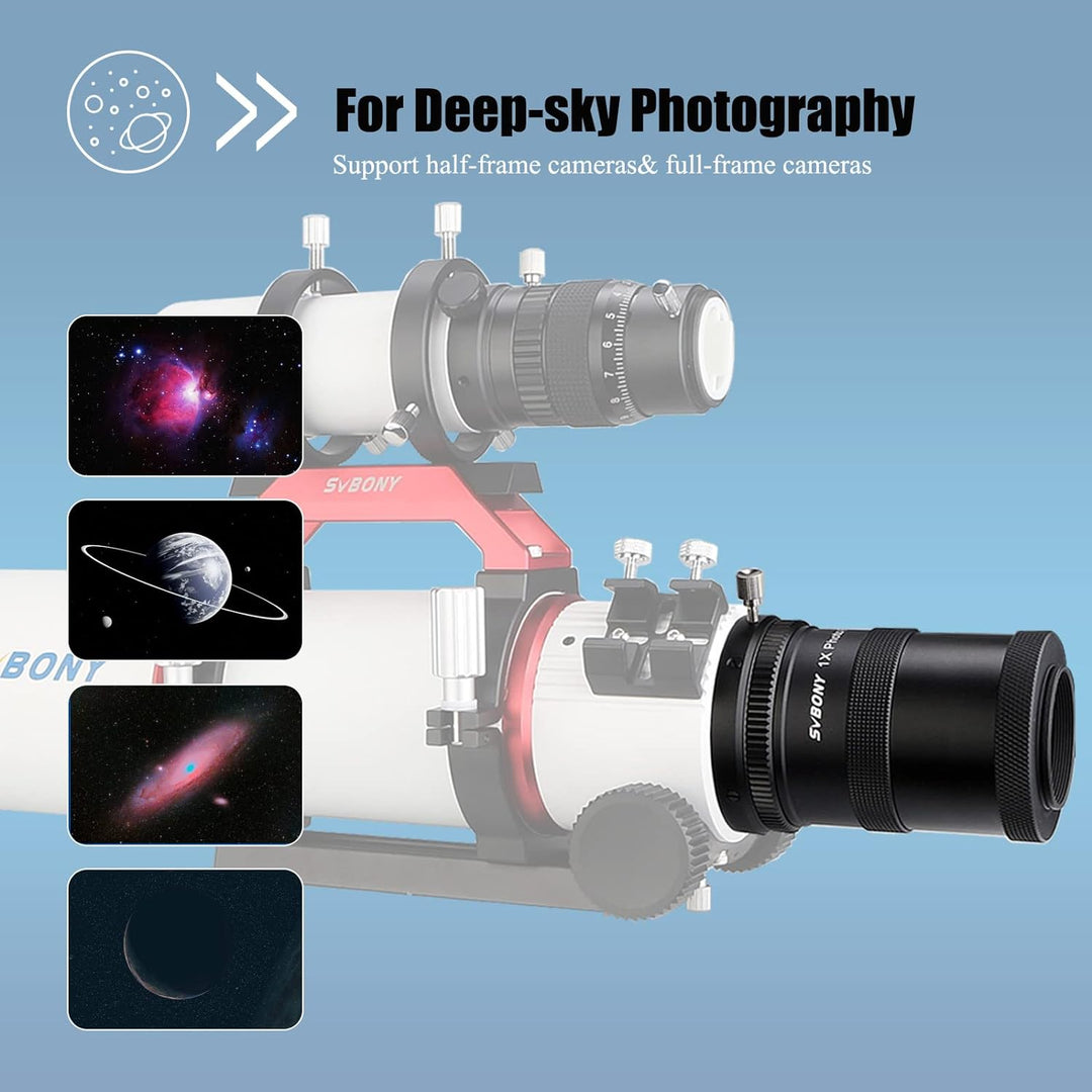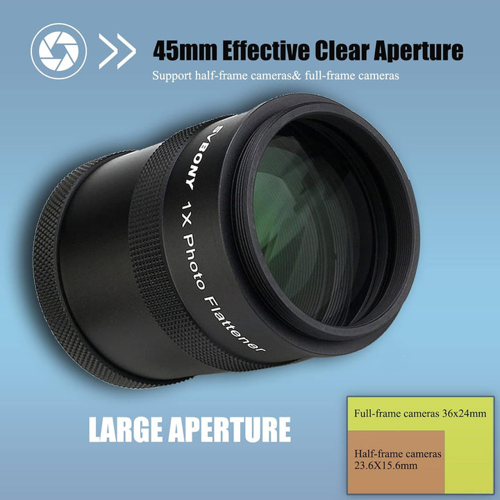 - Grosse Blende; 45mm effektive klare Blende; unterstützt nicht nur Halbbildkameras; aber auch Vollformatkameras; Verbesserung der Fransenfeldkrümmung von Weltraumaufnahmen und das Bild ist klarer; Es ist eines der notwendigen Zubehörteile für die Deep
