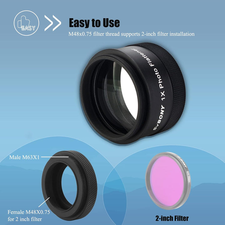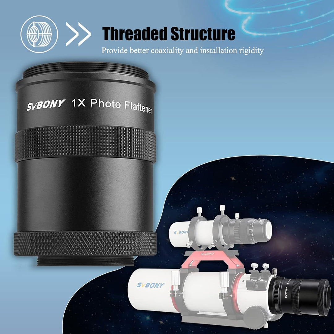 - Benutzerfreundlichkeit; M48x0,75 Filtergewinde; SV209 Field Flattener wird mit Standard 2 Zoll Filter Montagegewinde geliefert; Unterstützung 2 Zoll Filter Installation; Kunden müssen keine Filterschublade mehr separat kaufen