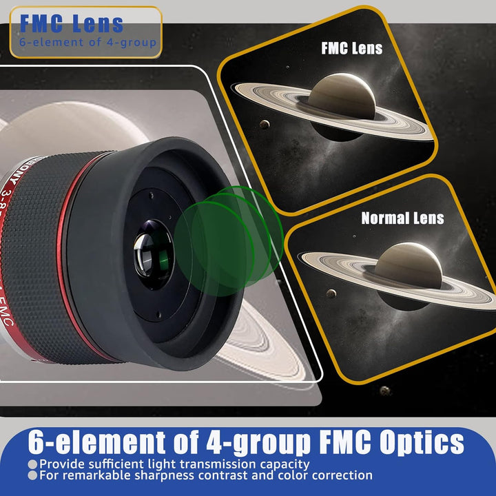 - 6-elementiges 4-Gruppen-Linsendesign mit FMC-Beschichtung; das Reflexionsvermögen reduzieren und die Lichtdurchlässigkeit effektiv erhöhen; verbesserter Bildkontrast für Planetenbeobachtungsziele