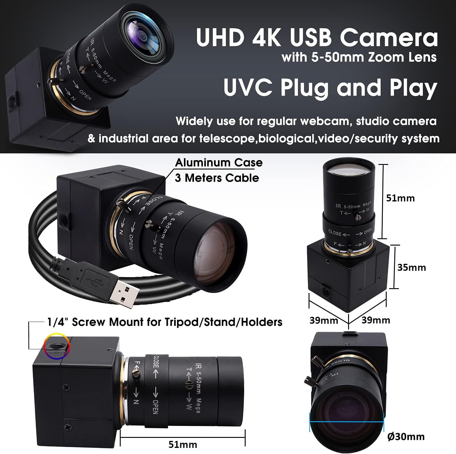 - 【Einfacher Zoom und manuelle Anpassungen】4KWebcam mit Zoomobjektiv 5-50mm, CS-Mount-Objektiv. Stellen Sie Fokus, Blende und Brennweite manuell ein, zoomen Sie für Nahaufnahmen oder Aufnahmen aus grosser Entfernung. Ultra HD USB-Kamera geeignet für viele Bereiche wie Machine Vision, elektrische Mikroskop, medizinische Maschine, regelmässige Haus und Büro mit