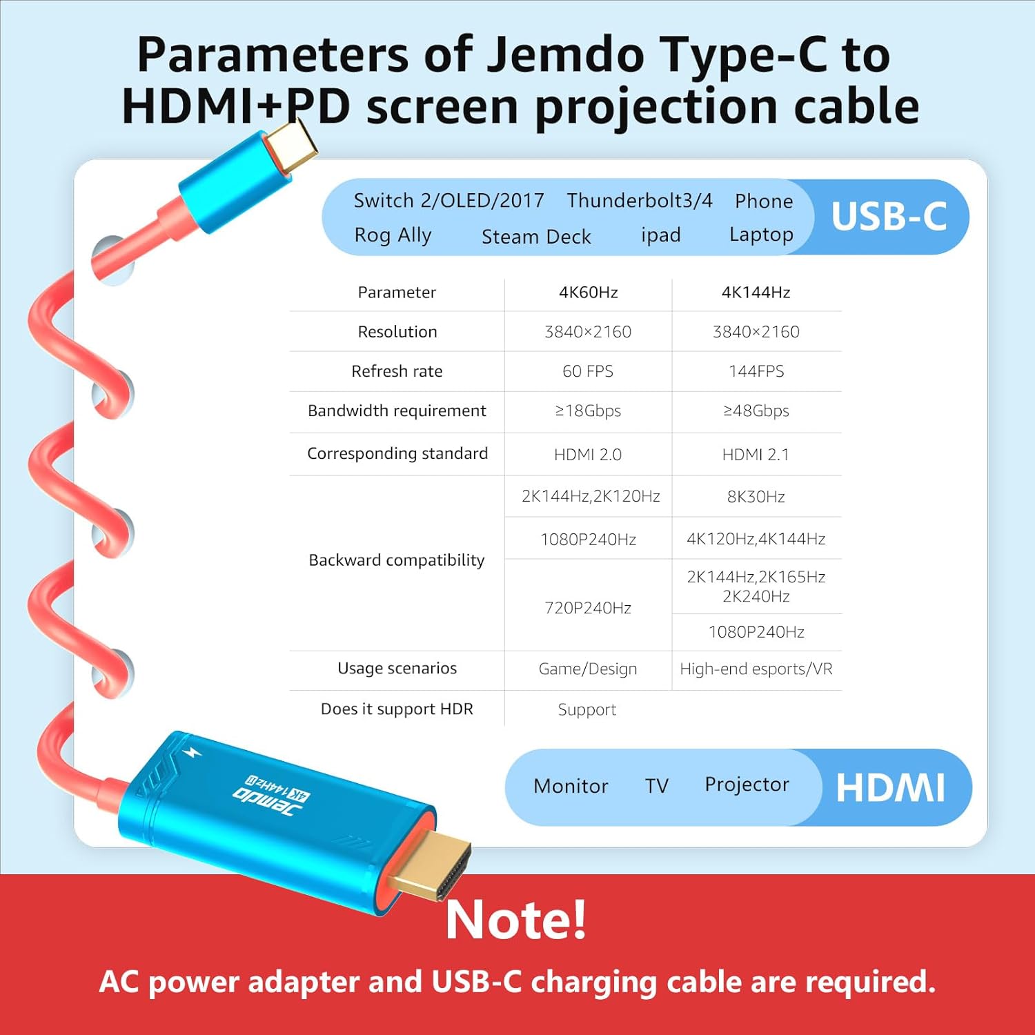 - HDMI 2.1 mit 48 Gbps für 4K@144Hz & Dynamic HDR Dieses Switch 2 USB-C-auf-HDMI-Kabel liefert brillante 4K@144Hz-Bilder mit 5.1-Surround-Sound – ohne Flimmern, Signalfehler oder Black Screens. Der moderne HDMI 2.1-Chip mit Dynamic HDR optimiert jedes