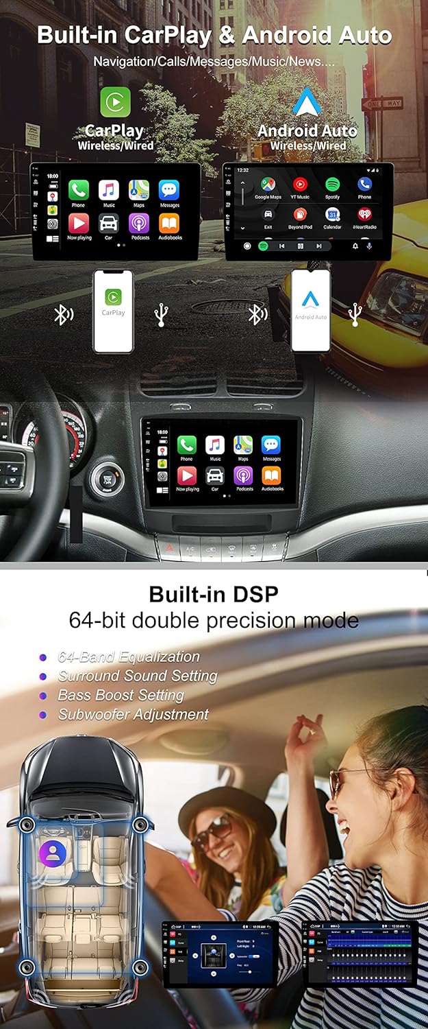 - 【DRAHTLOSES CARPLAY - ANDROID AUTO - DSP】①Integriertes drahtloses Carplay und Android Auto, unterstützt Funktionen Ihres Smartphones für die Verwendung im Auto, z. Sprachsteuerung mit Android Auto, Musikwiedergabe, Navigation, Telefonanrufe und