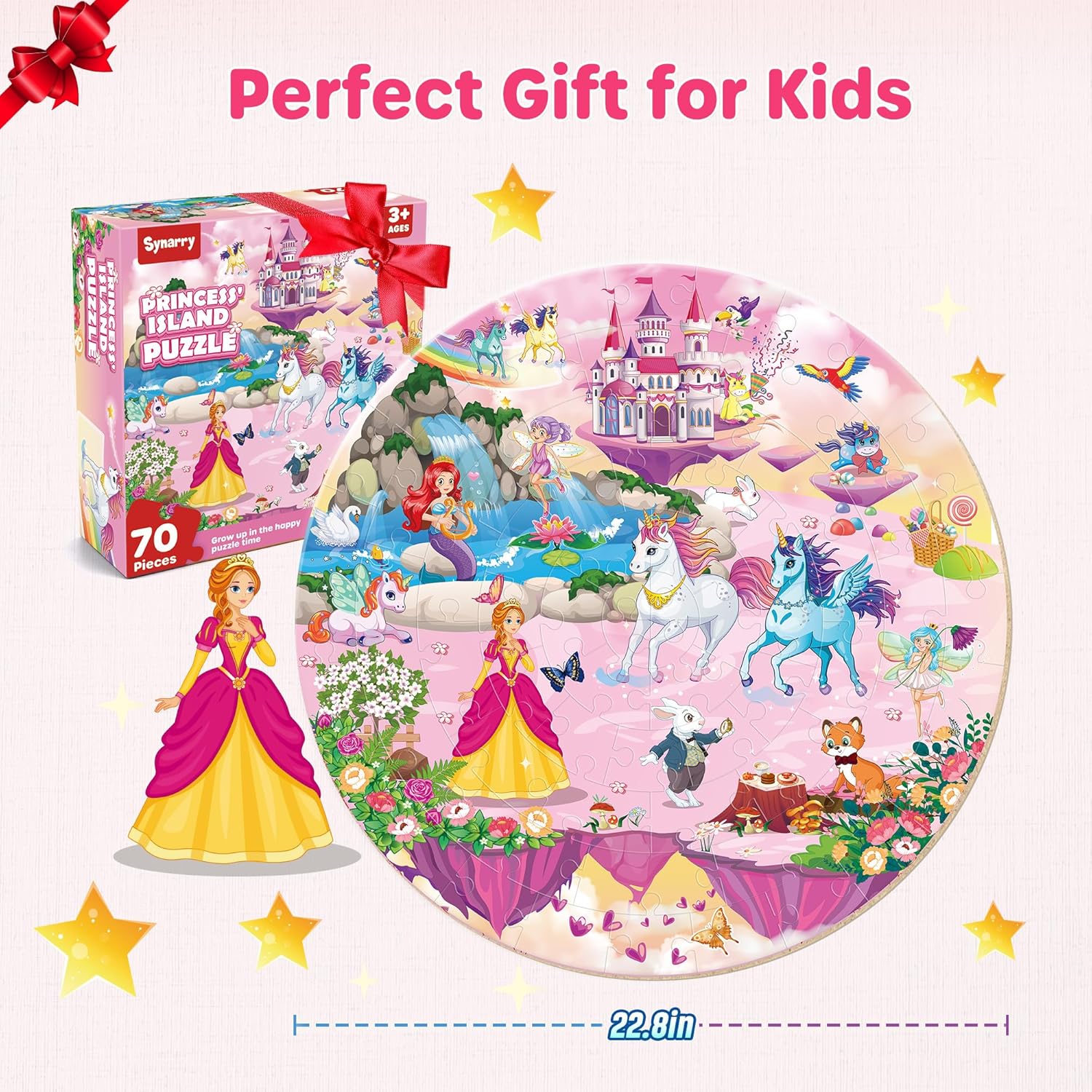 - Wunderschönes Bodenpuzzle: Dies ist ein 70-teiliges riesiges kreisförmiges Puzzle, darunter Einhorn, Prinzessin, Meerjungfrau, Fee, Kaninchen, Fuchs, Schwan, Regenbogen, Schloss usw., niedliche Cartoon-Muster und leuchtende Farben, die eine farbenfrohe