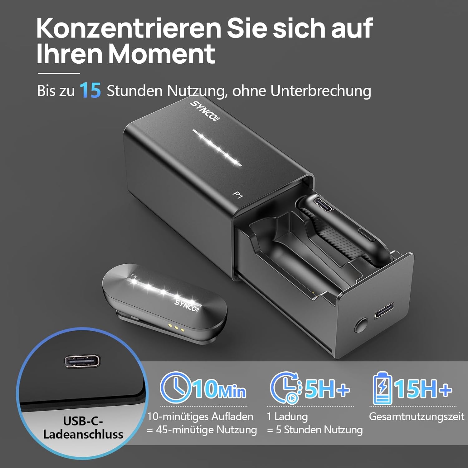 - 【150m stabile Übertragung】Mit Syncoder 3.0 und intelligentem DSP-Chip ermöglicht das SYNCO P1ST 2.4Ghz kabelloses Lavalier-Mikrofon für Android Type-C Geräte einen stabilen und klaren Klang innerhalb von 492ft/150m (LOS-Bereich), filtert