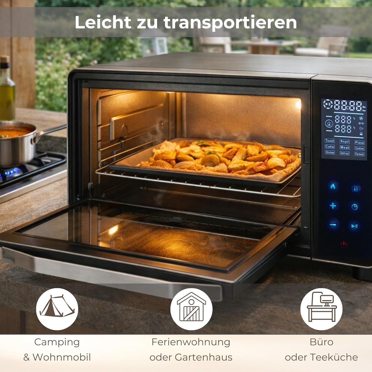- 🍕 Vielseitige Kochmöglichkeiten: Bereiten Sie Pizza, Fleischgerichte, Fisch, Kuchen und mehr zu - alles mit einem kompakten Gerät.