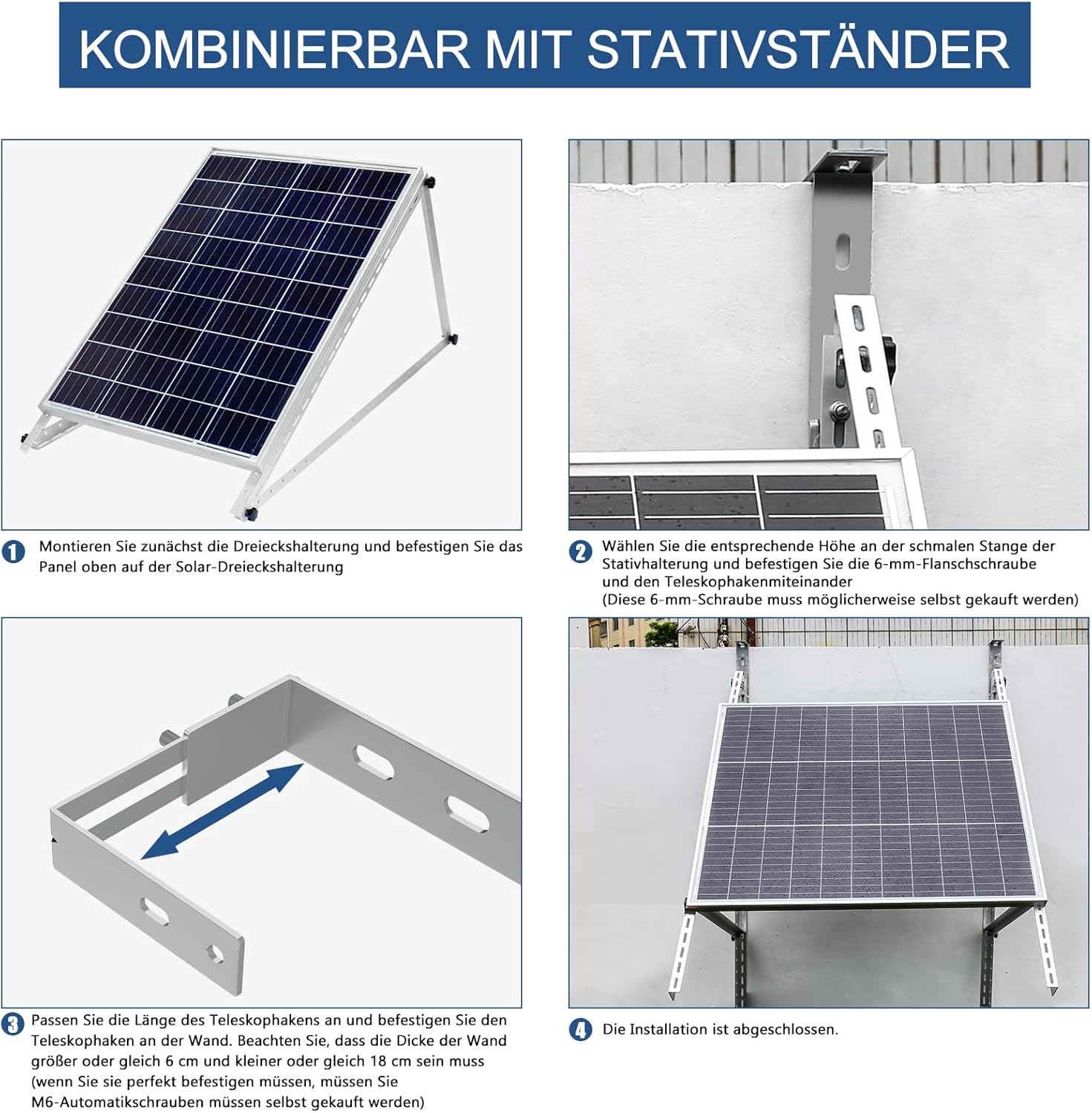 - Universelle Solar-Balkonhalterung: Balkongeländerhalterung, Solarpanel-Balkonhaken sind problemlos mit verschiedenen Balkonkraftwerken, Solarmodulen und Photovoltaiksystemen kompatibel, wie z. B. 41 Zoll, 45 Zoll grosse dreieckige Solarhalterungen,