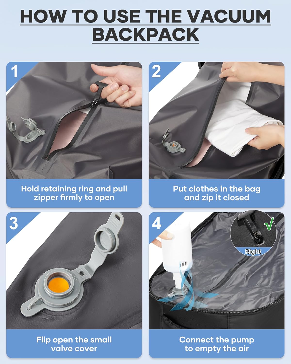- 【Vakuumpumpe】 Der Rucksack ist mit einer tragbaren Vakuumpumpe ausgestattet und mit verschiedenem Pumpenanschlusszubehör ausgestattet, sei es, um Ihr Gepäck schnell zu komprimieren oder den Packraum anzupassen, er bietet Ihnen grossen Komfort.