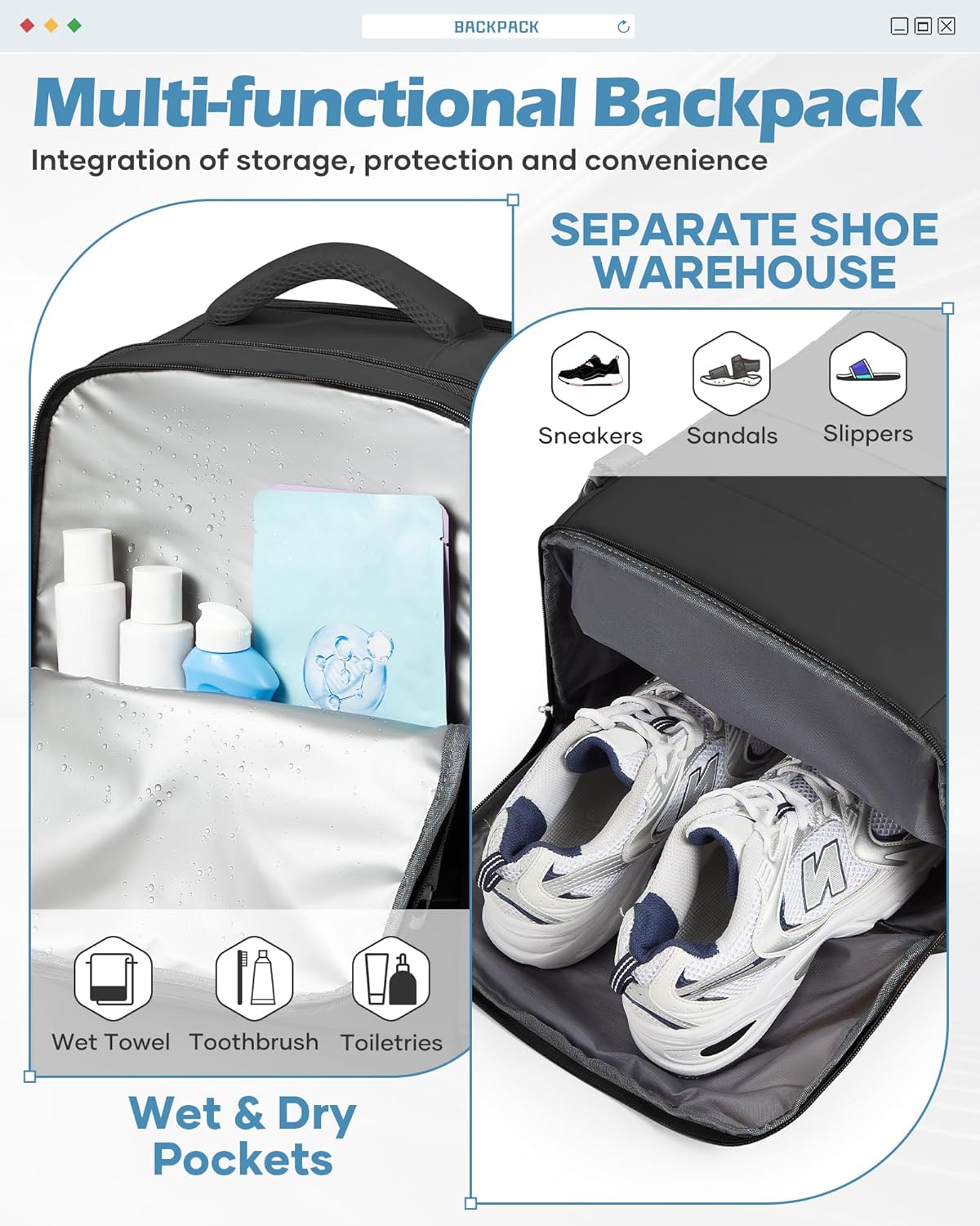 - 【Hohe Qualitätsdetails】Dieser Reiserucksack besteht aus wasserdichtem, leichtem Polyester und ist mit robusten Metall-Doppelschiebern sowie verstärkten Mehrfachnähten versehen, die die Lebensdauer des Rucksacks verlängern. Wenn der Rucksack voll