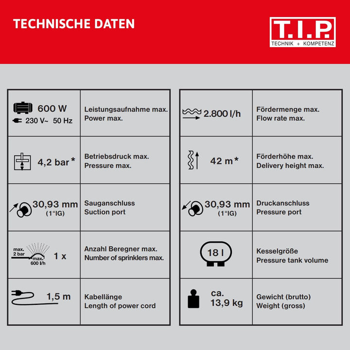 T.I.P. Hauswasserwerk Guss (2.800 l/h Fördermenge, 42 m Förderhöhe, 4,2 bar Druck, 600 W, Installati