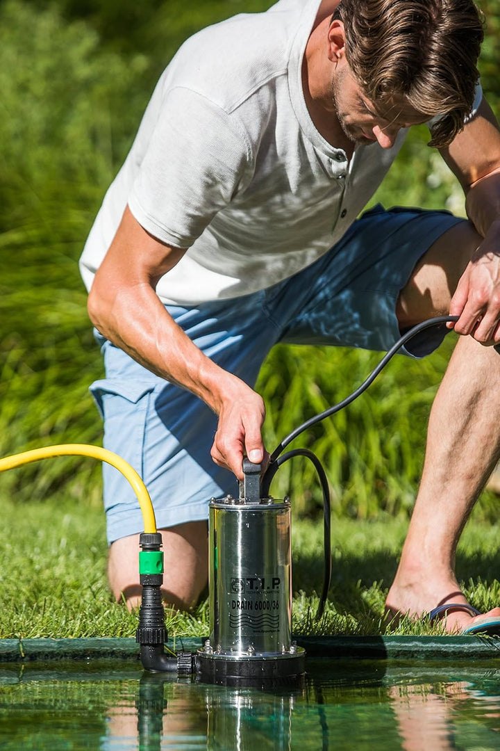 - Die Tauchdruckpumpe DRAIN 6000/36 ist speziell konzipiert für den mobilen Einsatz; zum Pumpen und zum Weiterleiten unter Druck von klarem Wasser bis zu 2 mm Korngrösse aus Brunnen und Zisternen mit einem Durchmesser von min. 500 mm