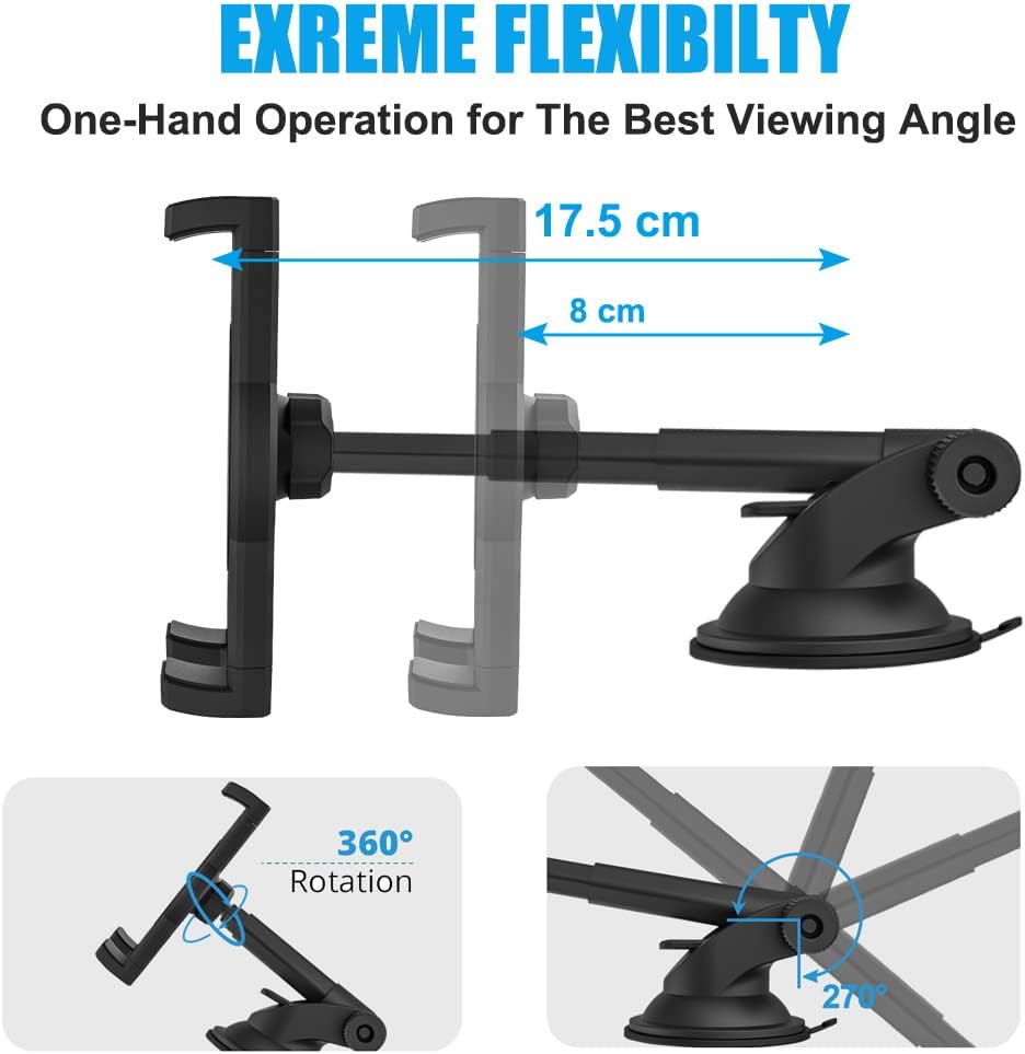 - 【Hohe Flexibilität】Diese Auto Tablet Saugnapfhalterung verfügt über einen verstellbaren Teleskophals (einstellbarer Längenbereich 8-17.5 cm). Bringen Sie Ihr Handy oder Tablet näher an den Treiber, damit Sie das Gerät leicht berühren können.