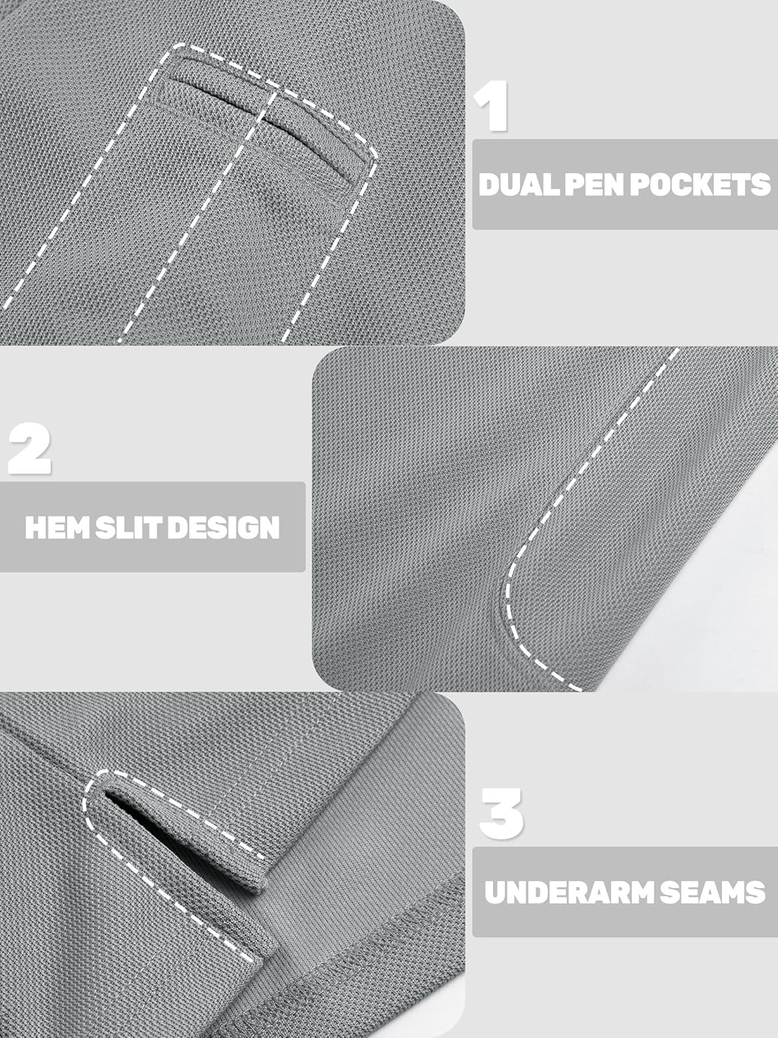 • Design-Highlights: ➊Kleine Brustschlaufe zum Aufhängen einer Sonnenbrille oder eines tragbaren Mikrofons ➋Zwei Stifttaschen am Arm, um Stift zu tragen, der beim Notieren leicht zu finden ist ❸Geschlitzter Saum für Bewegungsfreiheit.