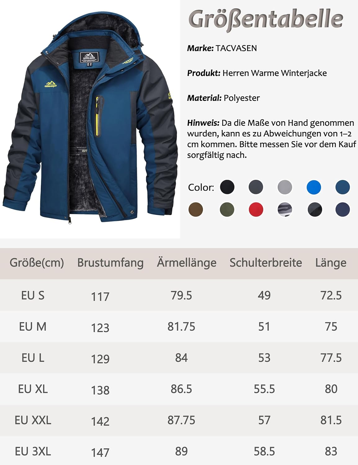 - Material: Polyester - Warm, Winddicht, Wasserabweisend, Bequem, Weich und Atmungsaktiv.