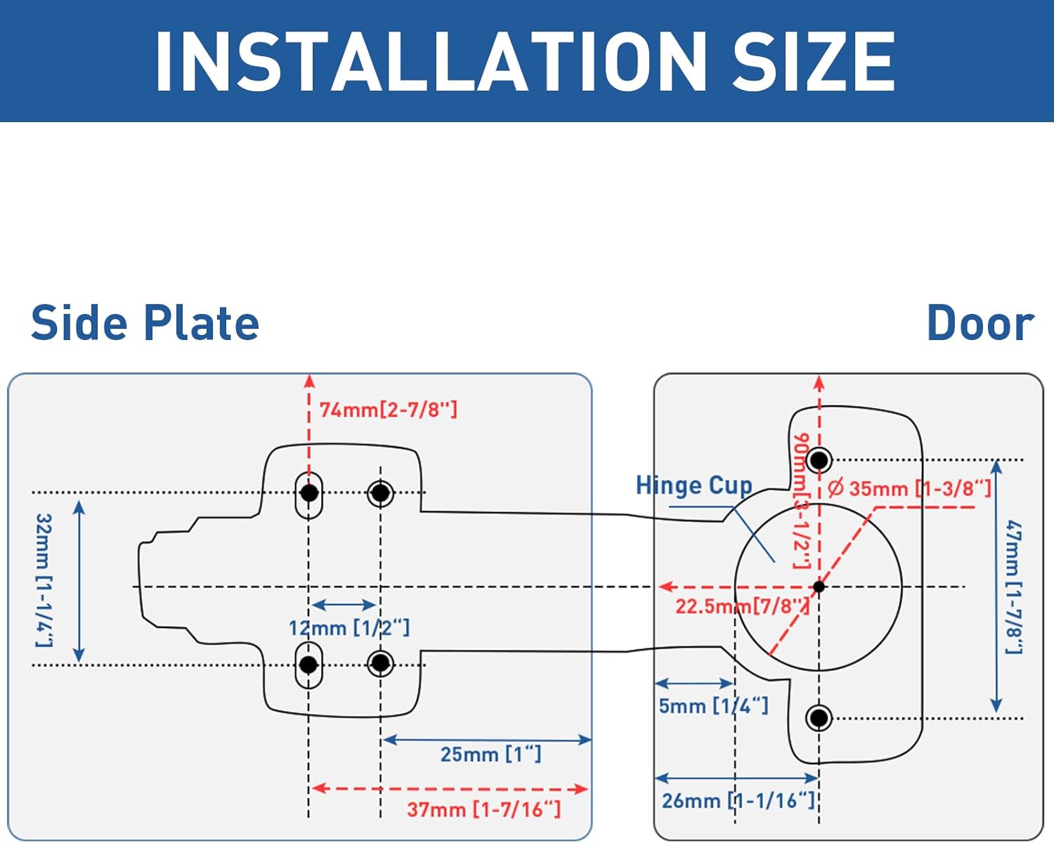 - Spezielle Masse: Scharniere mit Topfgrösse 35 x 12 mm und einem oberen Lochabstand von 48 mm, passend für Türstärken von 15–19 mm.