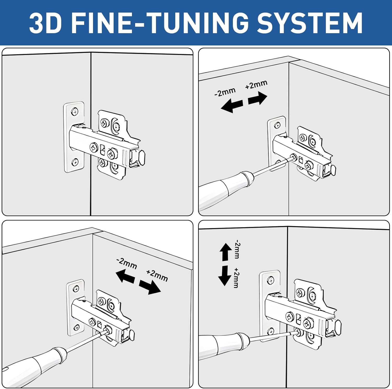 - Einfache Montage und Ausrichtung: Sanft schliessende Scharniere, die sich leicht montieren und justieren lassen, für eine einfache Ausrichtung und sanft schliessende Schranktüren.