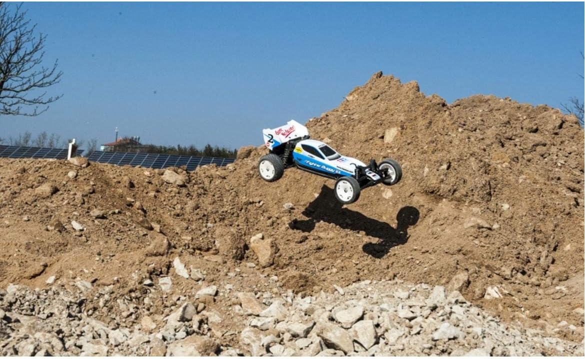 • Der etwas über 1 kg schwere Racing Fighter Buggy im Massstab 1:10 ist gut 40 cm lang und bietet dank des grossen Radstands noch mehr Spurtreue bei schnellen Fahrten. Sein schmales, fast röhrenförmiges DT-03 Chassis beinhaltet gut geschützt Elektronik