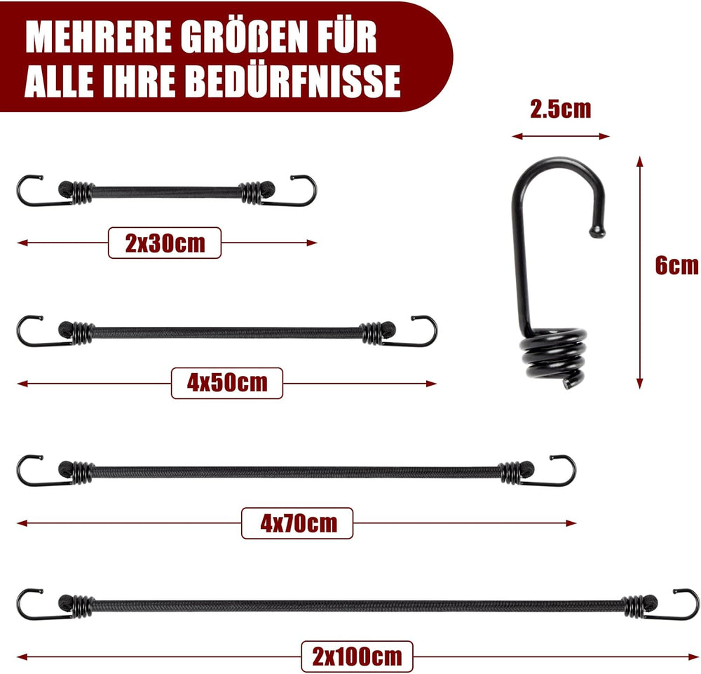 - ✅【Value Set】Dieses Set enthält 12 Stück spanngummis mit haken in verschiedenen Längen. 100cm*2, 70cm*4, 50cm*4, 30cm*2 ist vielseitig einsetzbar und kombinierbar. Spanngurte mit haken ist geeignet für Gepäckträger, Tarps, Fahrräder,