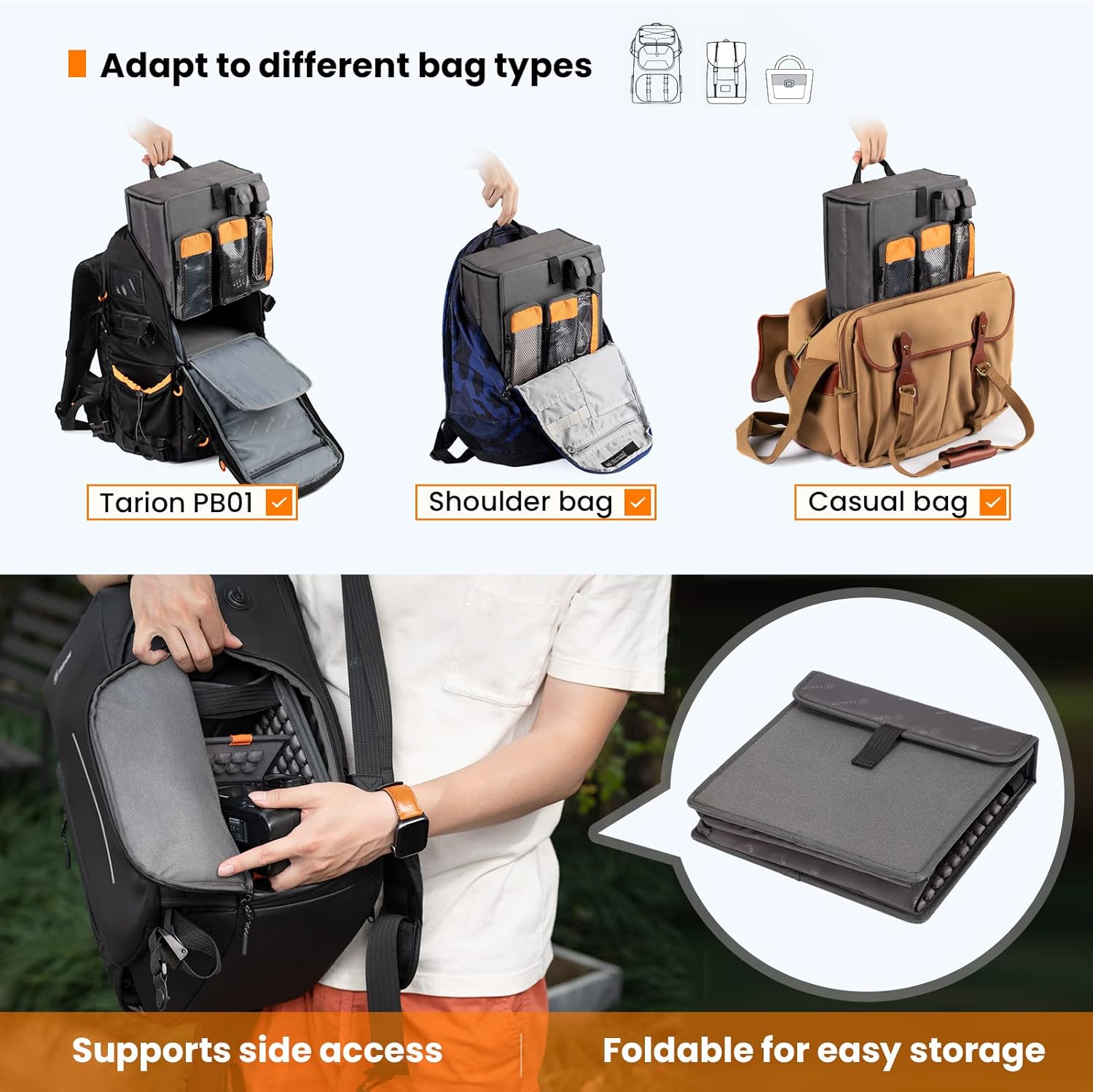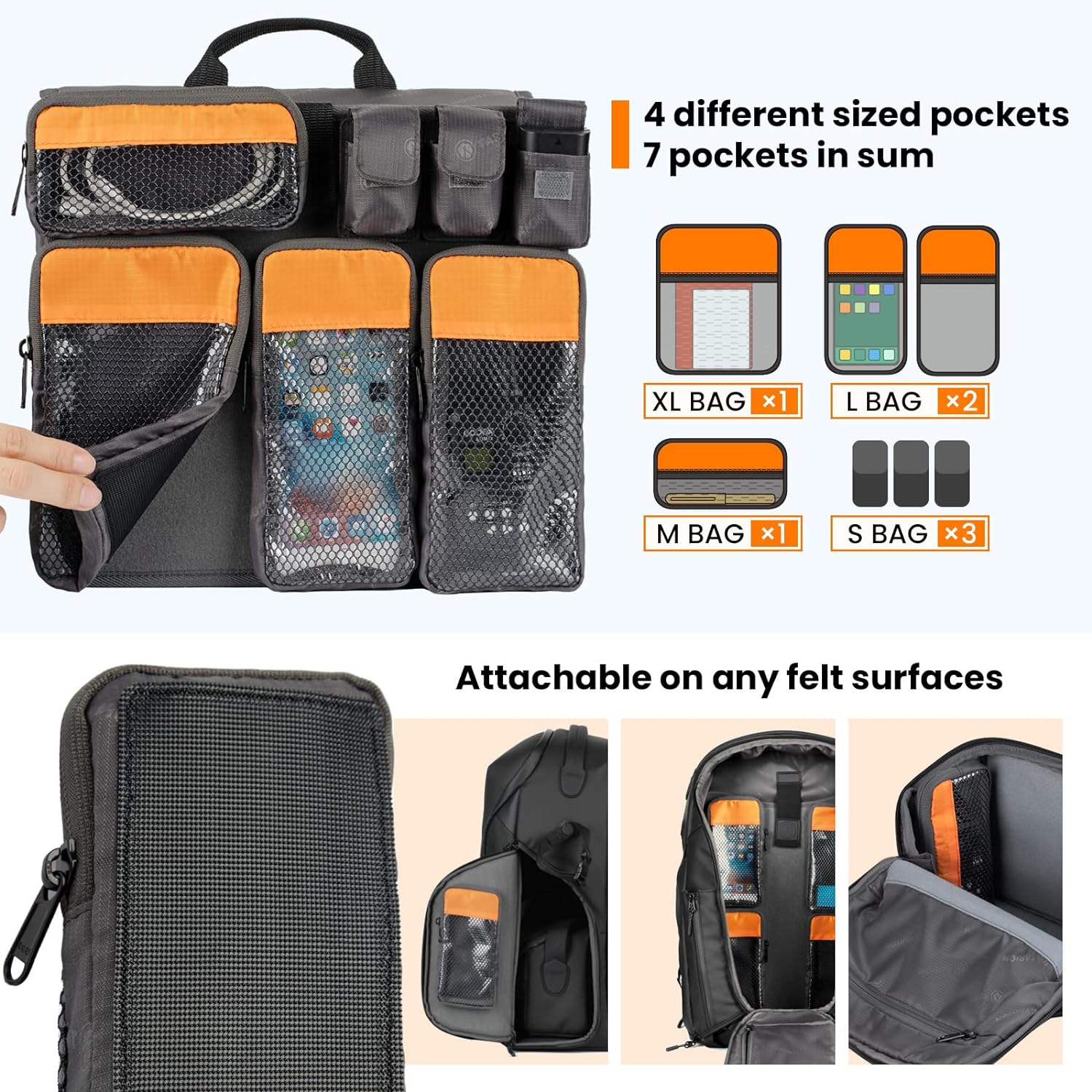 - 【Modulare Organizer-Taschen】: Bringen Sie eine Tasche an jeder Filzoberfläche von Tarion Zone an: Modularer Organizer-Einsatz, Begleittasche, seitliche Öffnung und die Rückwand des Rucksacks. 4 verschiedene Grössen ermöglichen es Ihnen, zu
