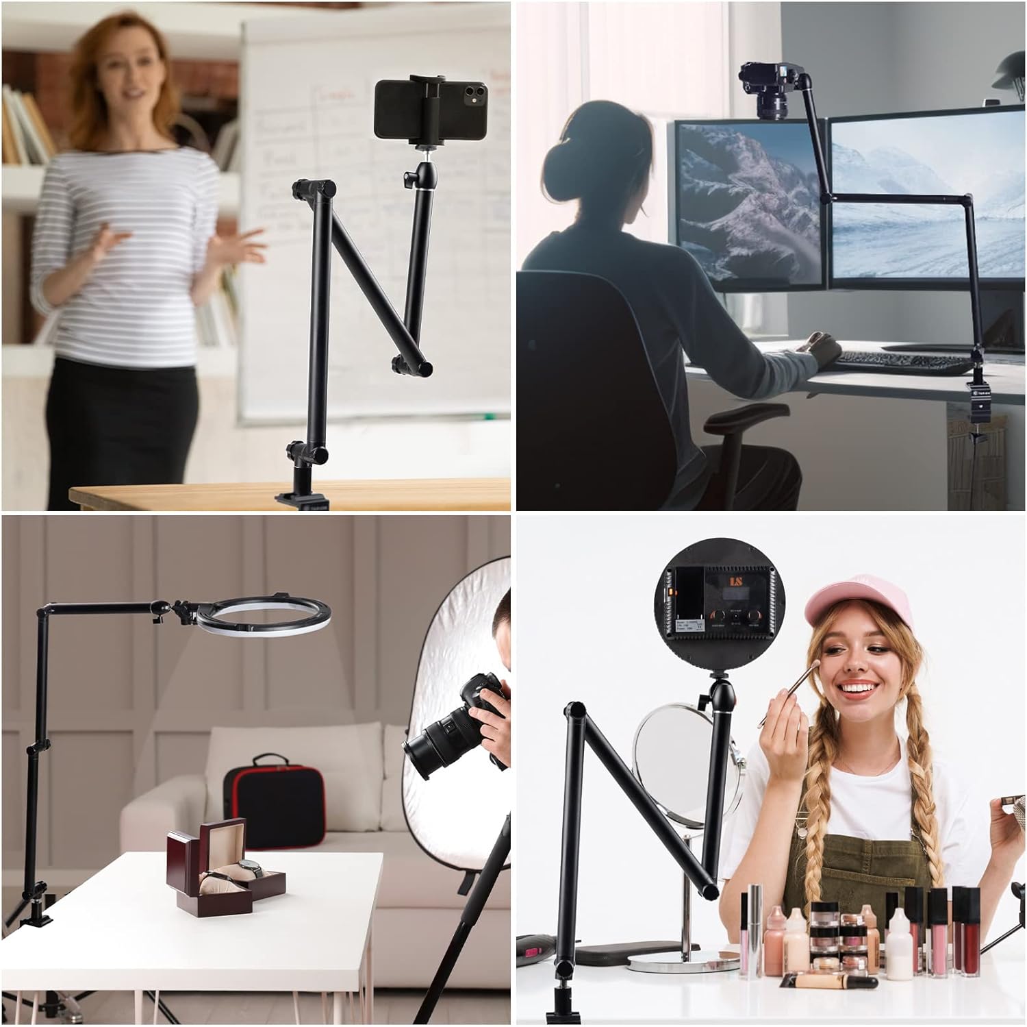 - 【Flexibles Tischstativ】 Der 3-teilige Auslegerarm mit 3 Verstellknöpfen ermöglicht eine präzise und einfache Verlängerung oder Verkürzung des Arms. Die Knöpfe sind vertikal um 360° verstellbar, die Rohrbasis ist horizontal um 360° drehbar und