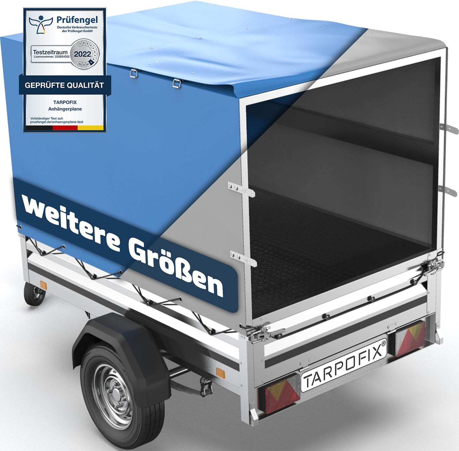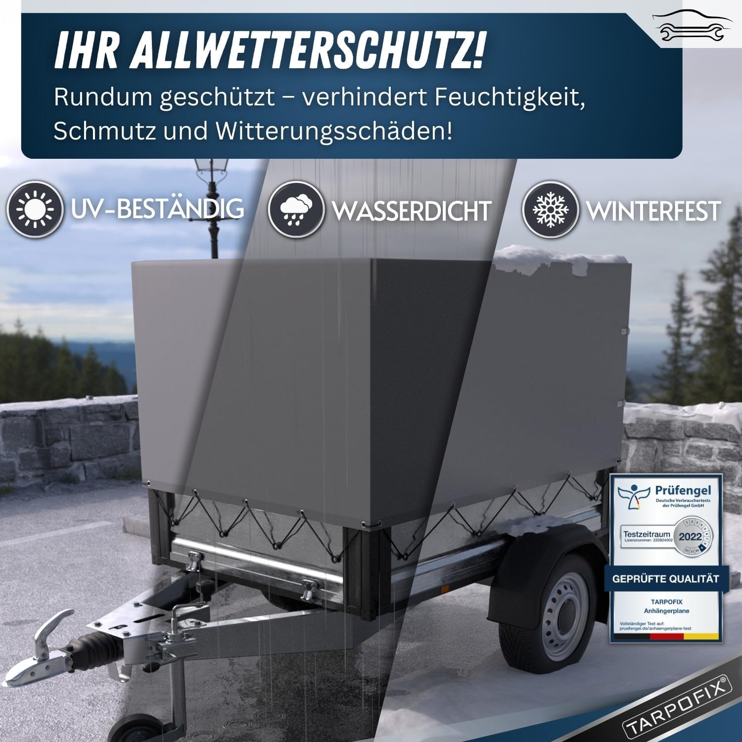 - ✔ 100% SITZ- & WASSERFEST - der 90cm hohe Überhang der Hängerplane garantiert einen festen Sitz der Anhängerabdeckung auf Gestell & Spriegel auch während der Fahrt & hält den Hänger Kastenraum völlig trocken!