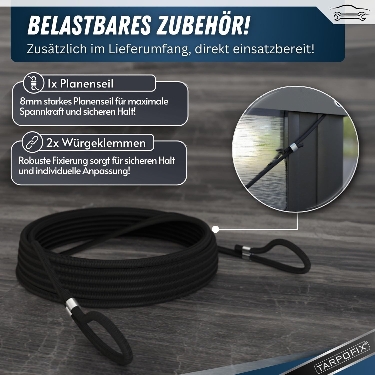 - ✔ NACHHALTIGE VERARBEITUNG - doppelt gefalztes Material entlang der Aussenkanten - sämtliche Ösen & Ränder werden verstärkt und hochtemperiert verschweisst, um typischem Verschleiss der Schutzplane entgegenzuwirken!