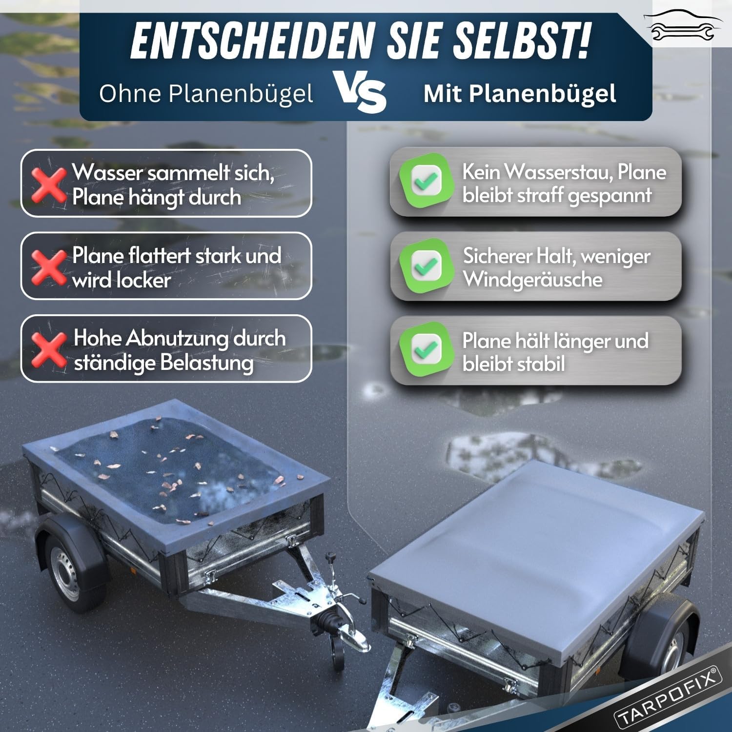 • ✔ IDEAL PASSEND - Die Planen Bügel sind flexibel einstellbar - die Hängerabdeckung passt ideal auf diverse Stema & Pongratz Autohänger sowie auf diverse flache 500 kg, 750 kg und 850 kg KFZ Autoanhänger