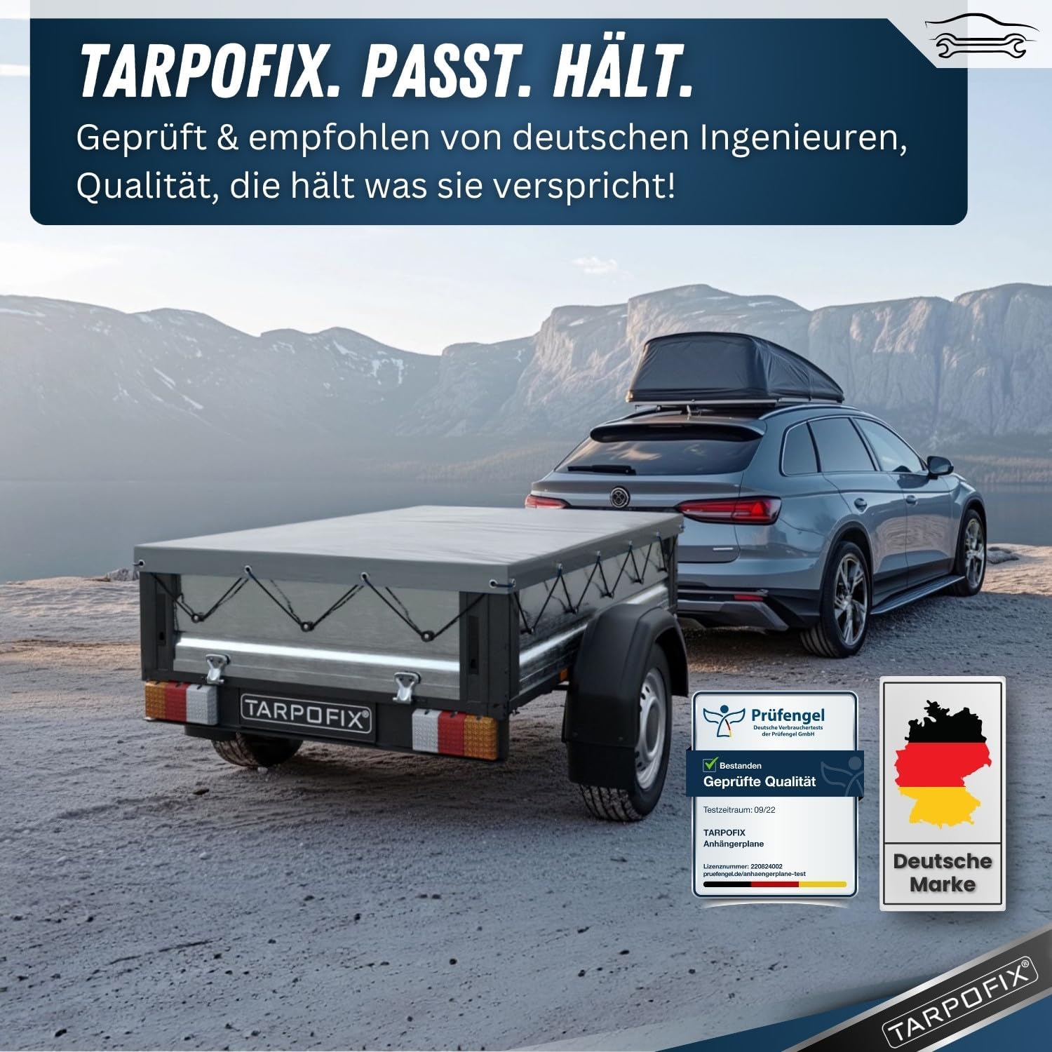 Tarpofix® Anhängerplane Flachplane 2075x1140 + 3x Planenbügel (verstellbar 100-145 cm) - randverstär
