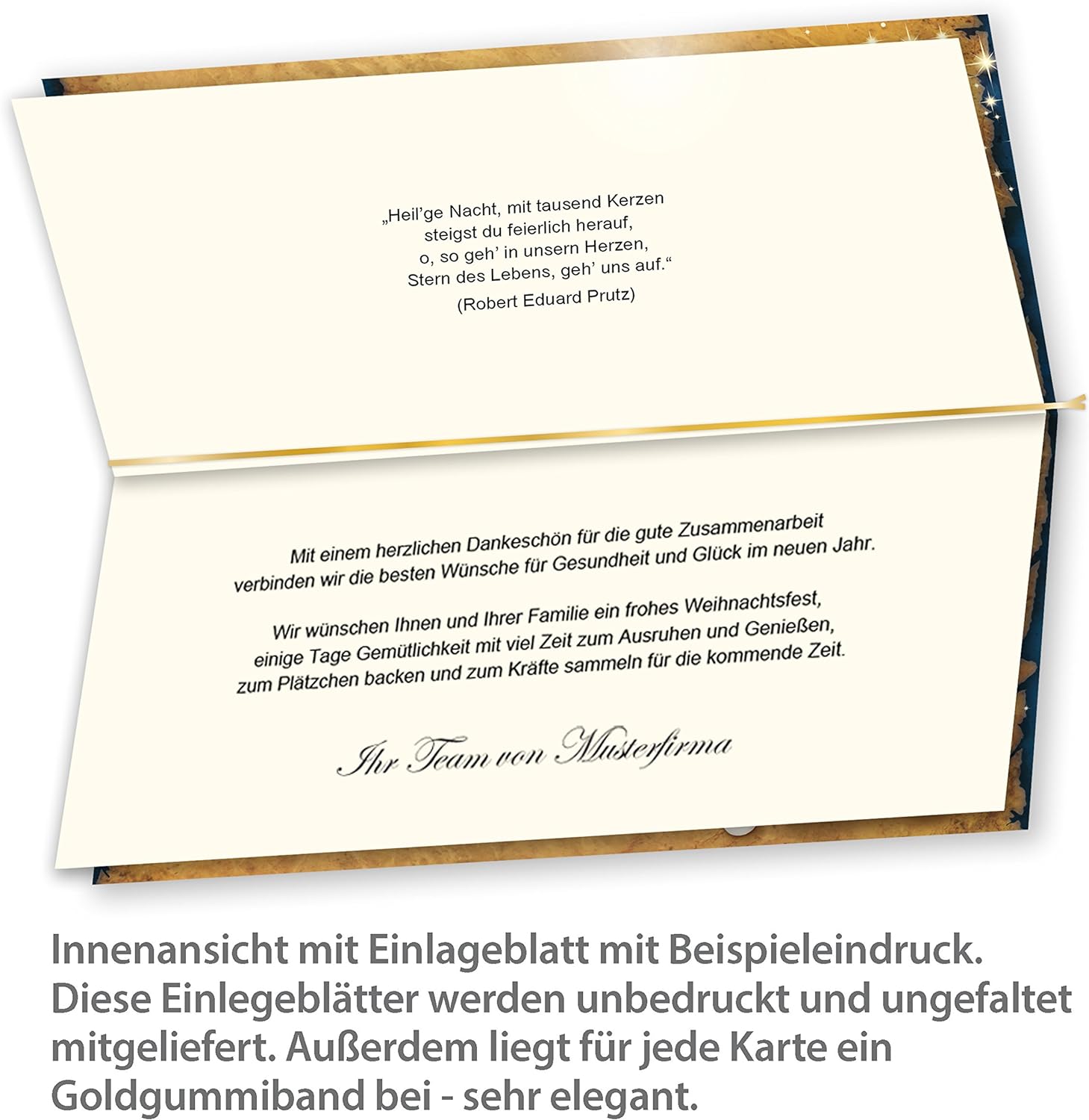 - Sie können das Einlegeblatt dieser Weihnachtskarten selbst bedrucken oder von Hand beschreiben, danach können Sie das Einlegeblatt falzen und mit den beigefügten Goldbändern in der Weihnachtskarte fixieren. Mit den dazugehörigen Briefumschlägen