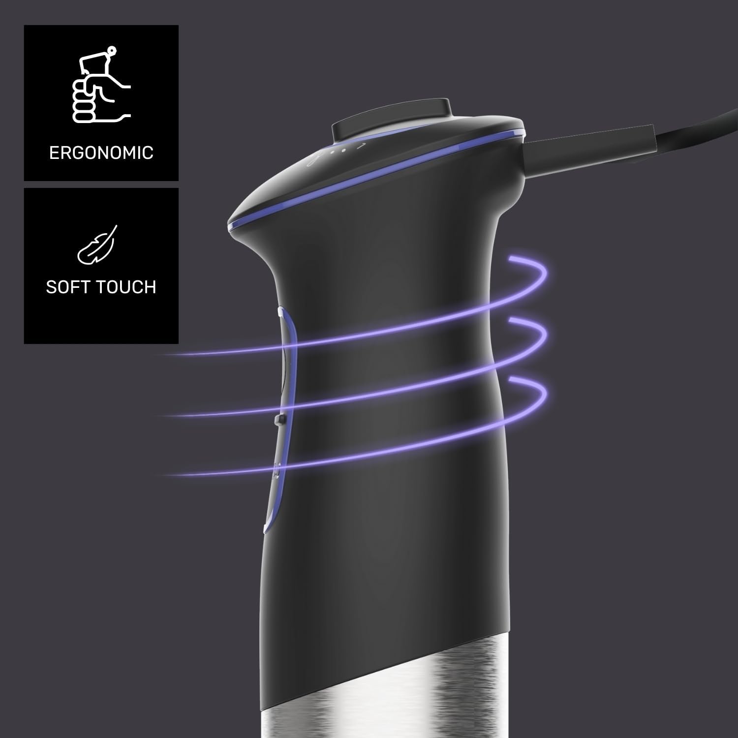 • Stabmixer 1000W, 20 Geschwindigkeitsstufen, Turbo-Funktion, 4 Klingen aus Edelstahl, ergonomisches Soft-Touch-Design, Spritzschutz, Zubehör