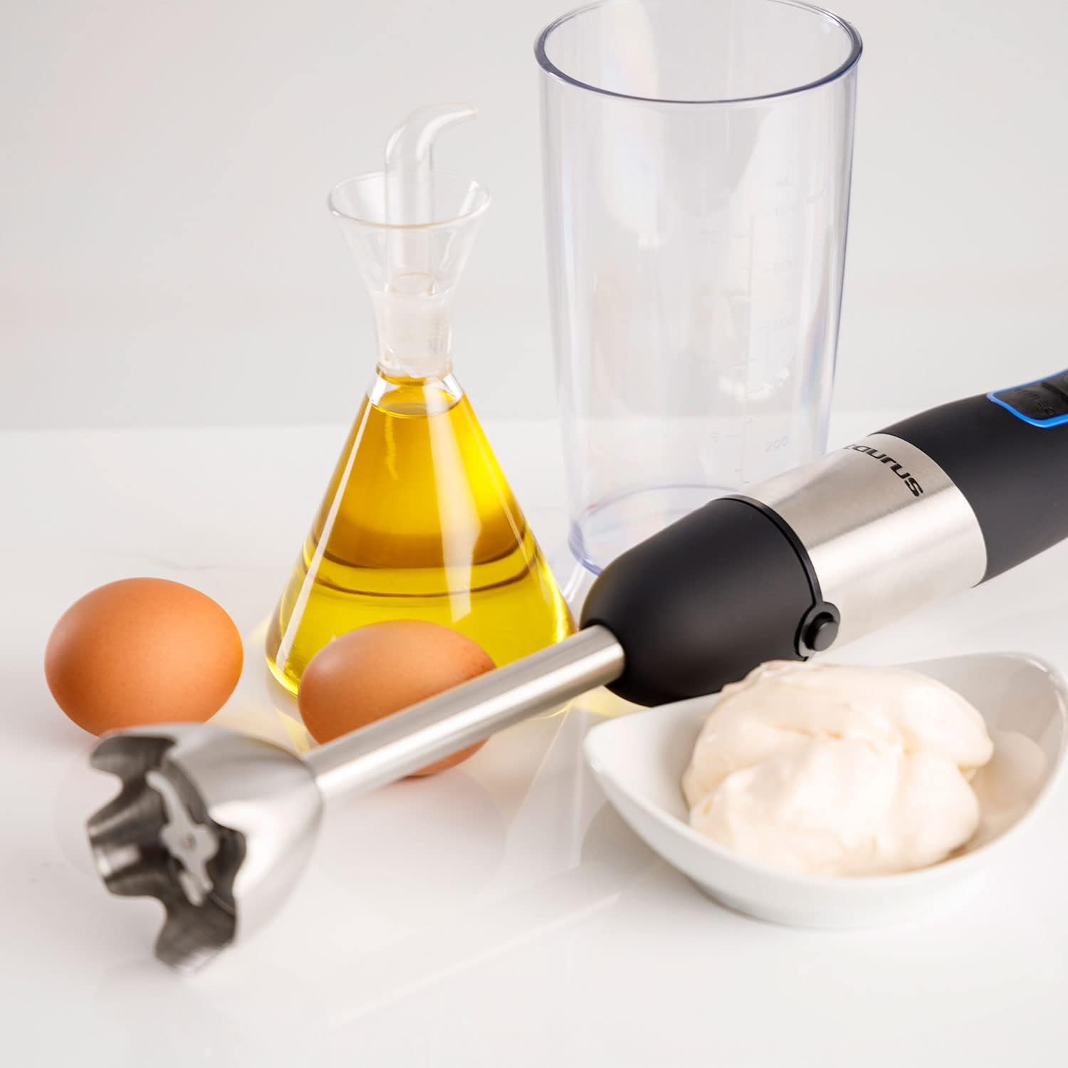 • 1000 W. Hohe Leistung zum schnellen Mischen aller Arten von Lebensmitteln mit Hochleistungsklingen aus rostfreiem Stahl.
