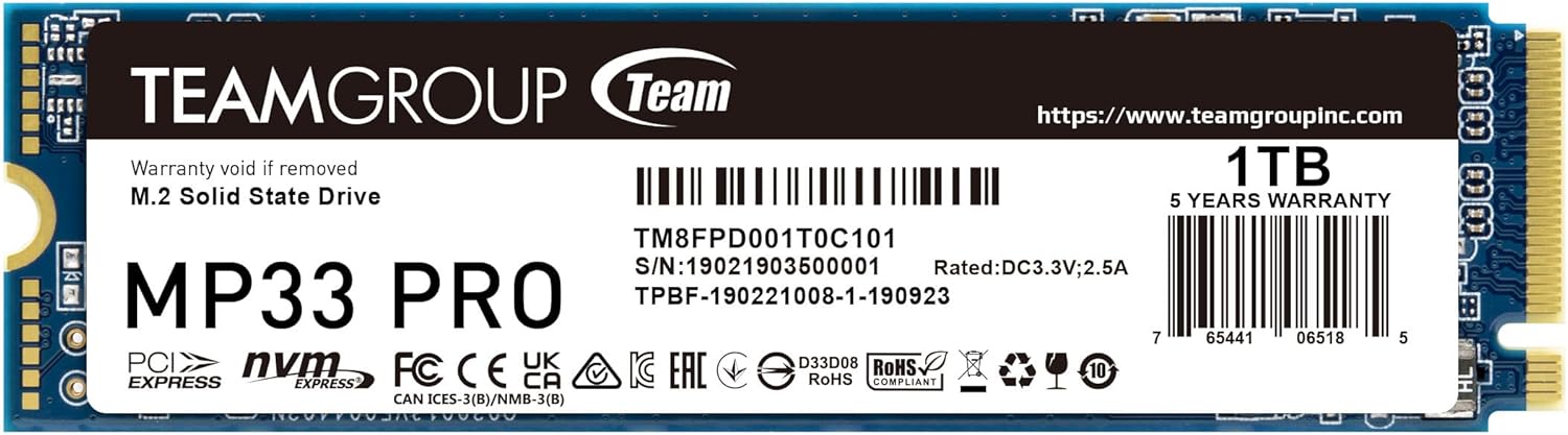 - TEAMGROUP MP33 PRO 1TB M.2 PCIe 2280 NVMe 1.3 interne SSD, bis zu 2100 MB/s Gen3x4 Solid State Drive, Terabyte Written TBW>600TB TM8FPD001T0C101