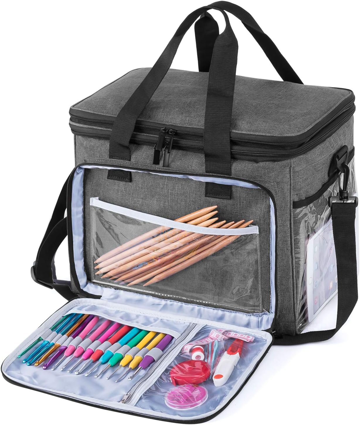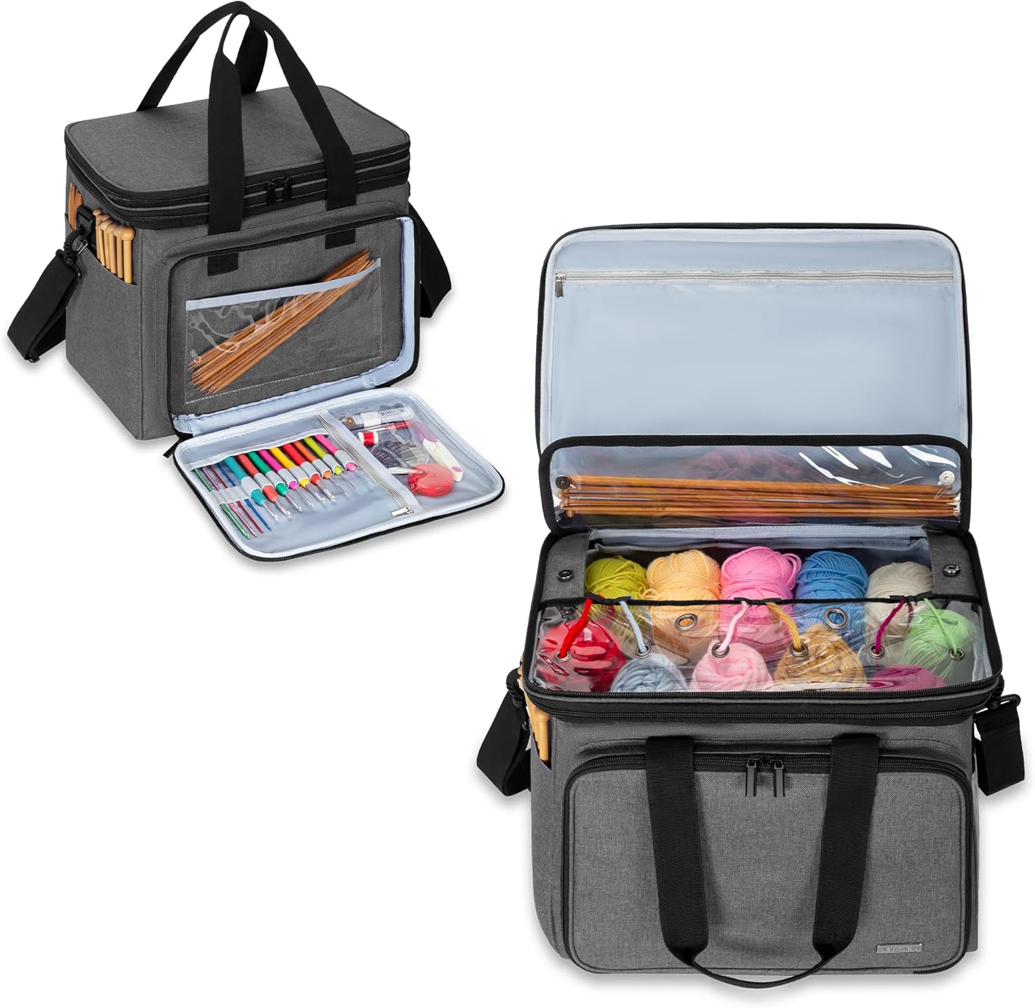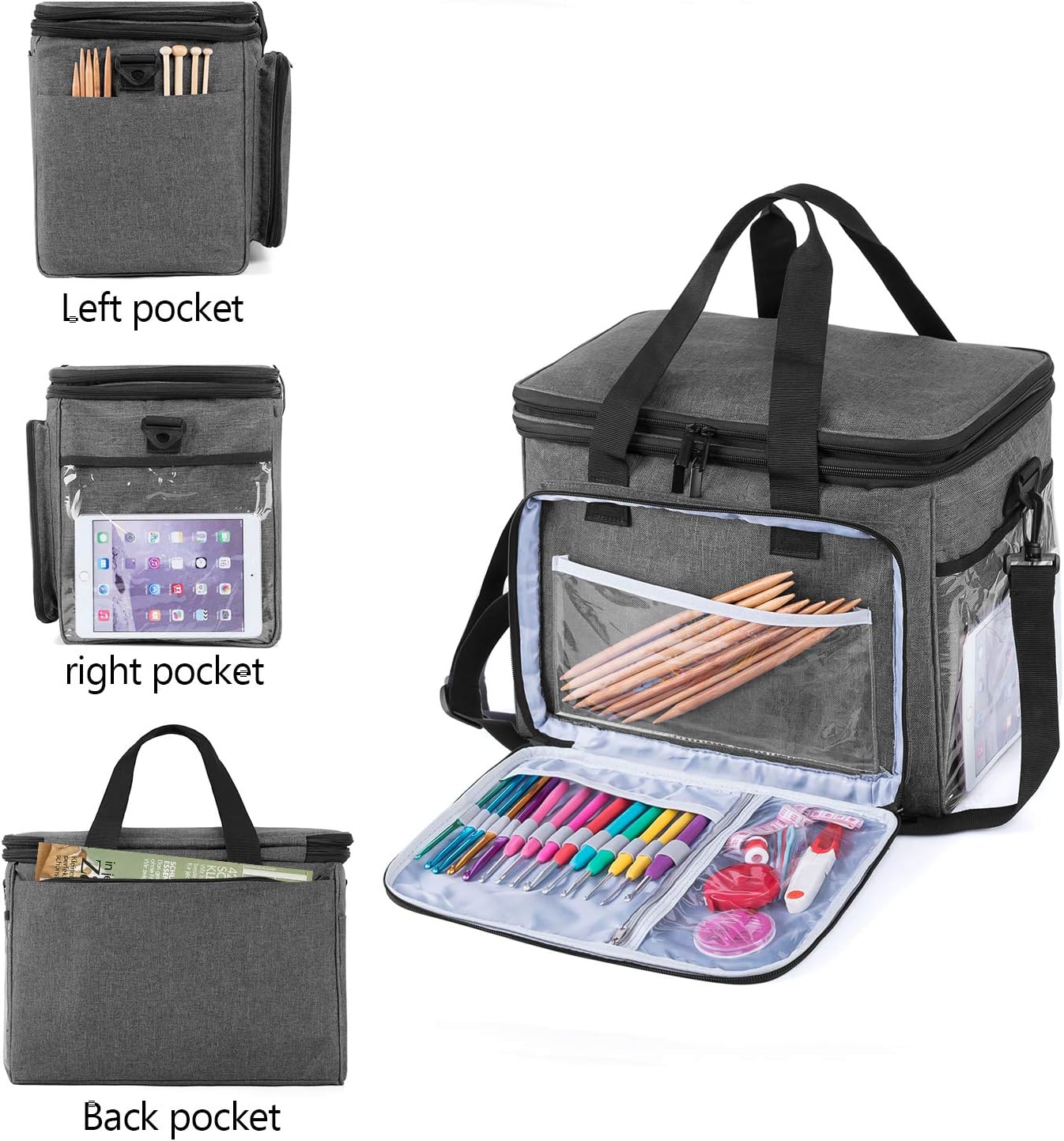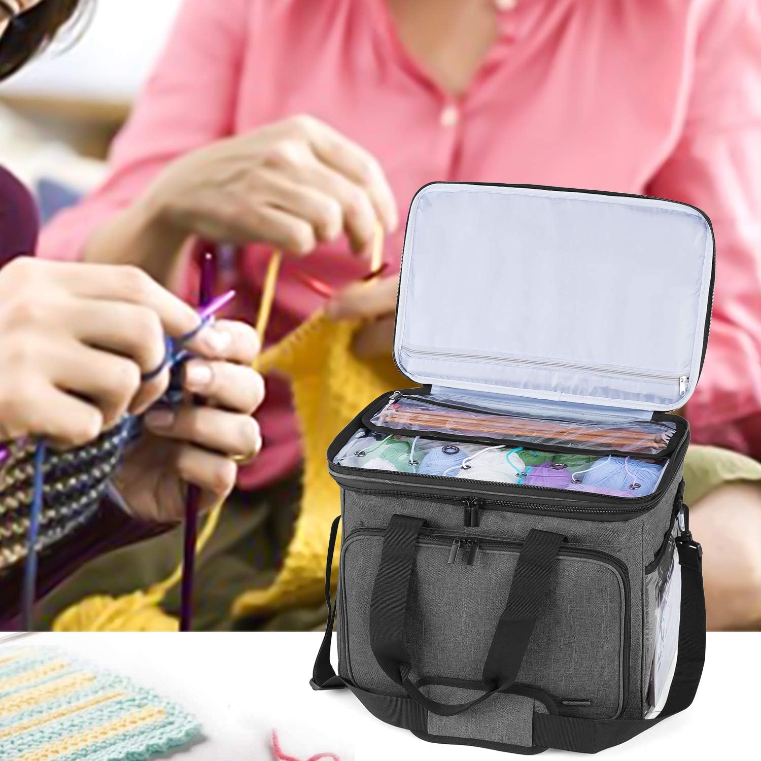 - KLAR OBEN: Die flexible und klare PVC-Abdeckung ermöglicht es Ihnen, leicht zu sehen, was innen ohne Öffnen der Tasche. Die 6 kleine Löcher und 2 grosse Löcher für verschiedene Farben des Garns zum Durchfliessen. 3 Sätze Klettstreifen halten Garn